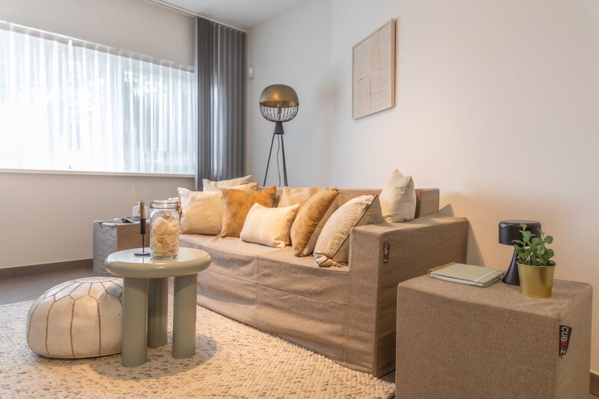 You enter through the neat, low-maintenance front garden with a seating area. The sleek red brick, light-colored cladding, and modern front door with glass panel immediately set the tone: tidy, timeless, and with an eye for detail. In the hallway, you’ll find a separate, modern toilet; from there, you step into the bright living room.