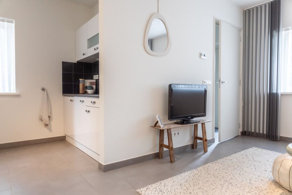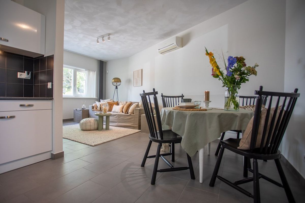 De woonkamer is een prettig, open geheel met doorlopende grootformaat keramische vloertegels in het grijs, strak gestucte wanden en plafond met spotrail. De brede raampartij zorgt voor veel daglicht en een rustige sfeer; textielaccenten en de nette afwerking maken het geheel warm en uitnodigend. Een split-airco aan de wand biedt extra comfort op warme dagen. Aansluitend ligt de eethoek met zicht op de halfopen keuken: compact en verzorgd, met witte, glanzende fronten, een donkere tegelspatwand, onderbouwverlichting en een donker werkblad met voorbereid leidingwerk voor een kookplaat. Ideaal voor wie efficiënt wil koken zonder ruimteverlies.
