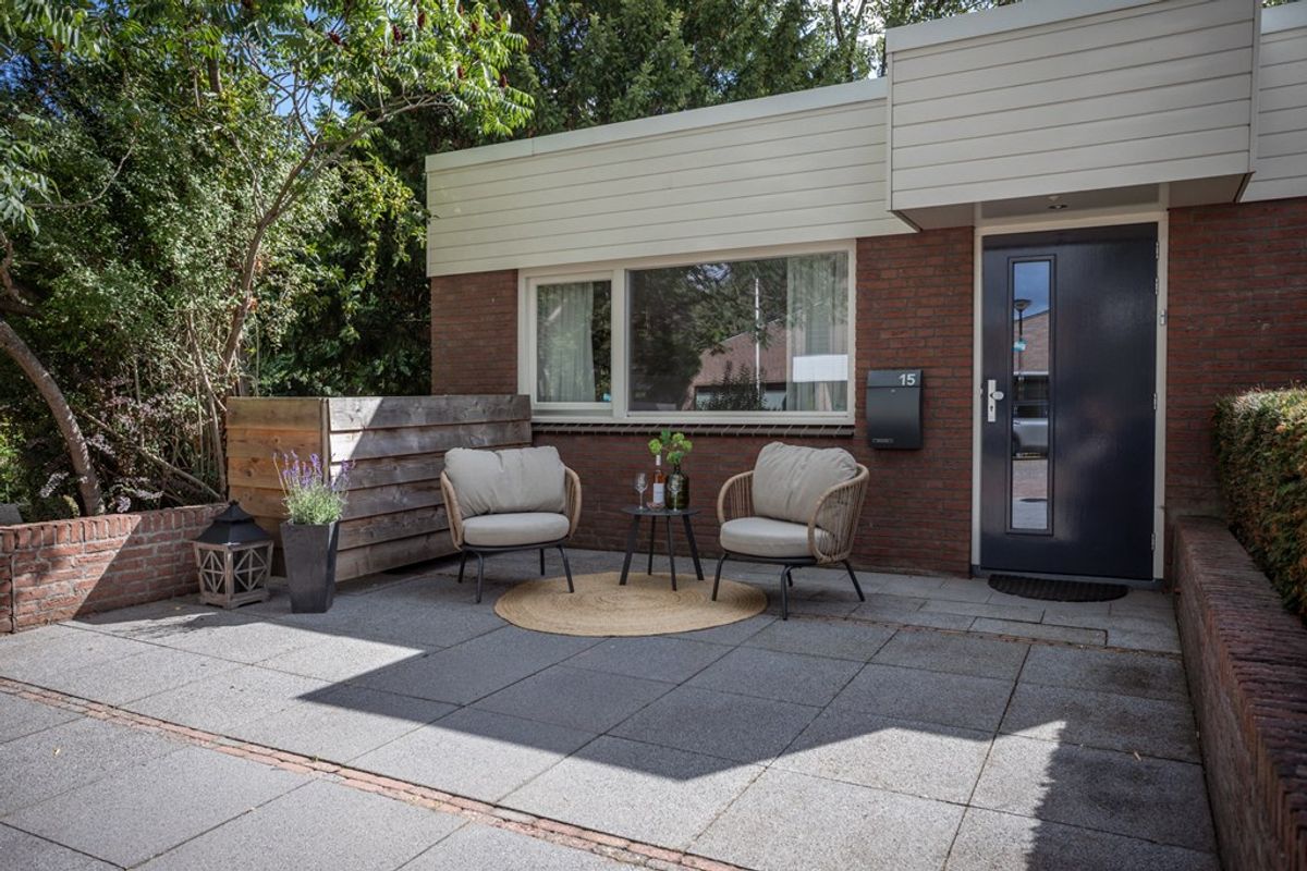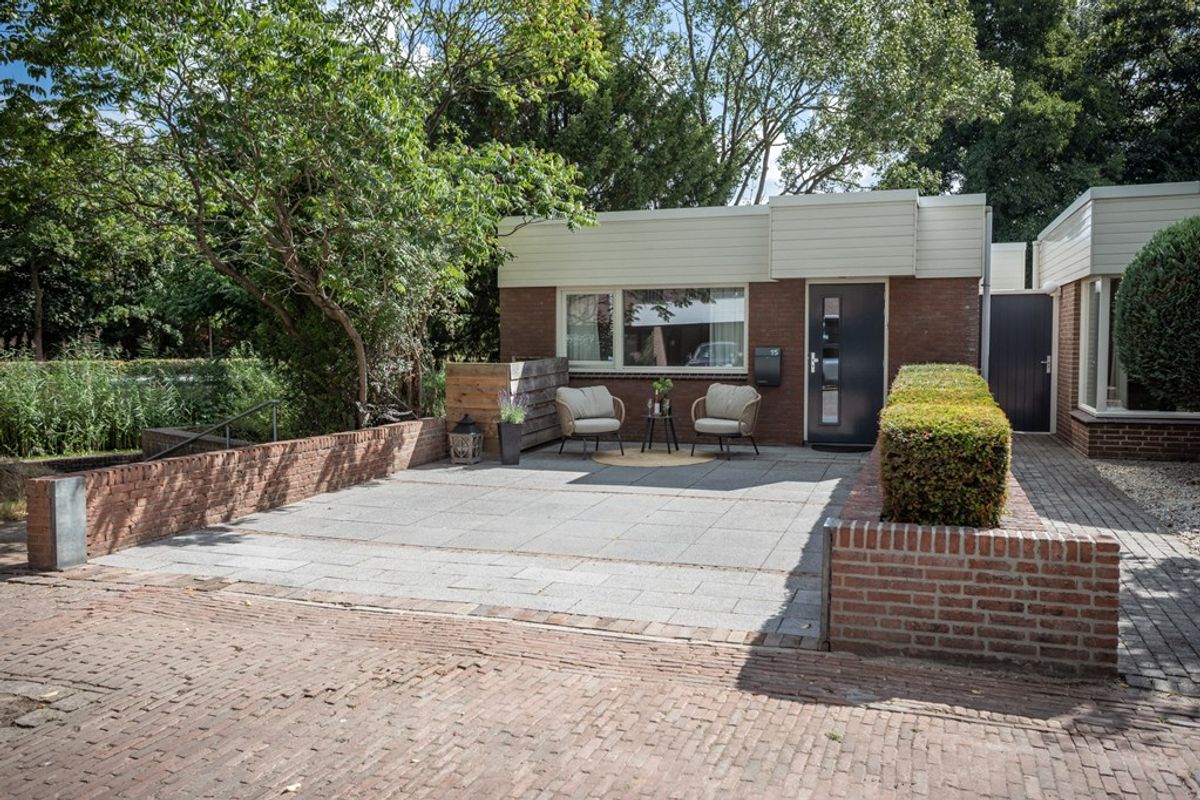 Buiten geniet je aan de voorzijde van een royaal, volledig bestraat terras, privacy door hagen en groen, waar je fijn een koffiehoek of lounge kunt creëren. Riet, volwassen bomen en hagen geven een intieme, landelijke sfeer.
