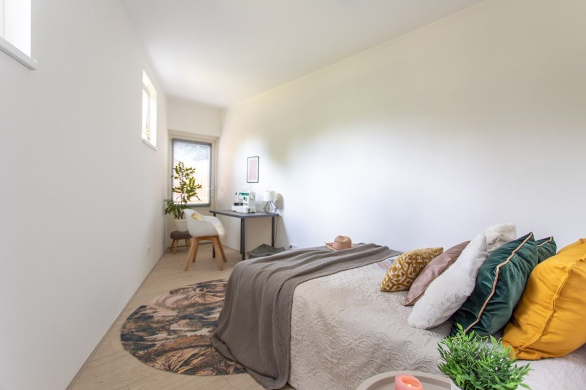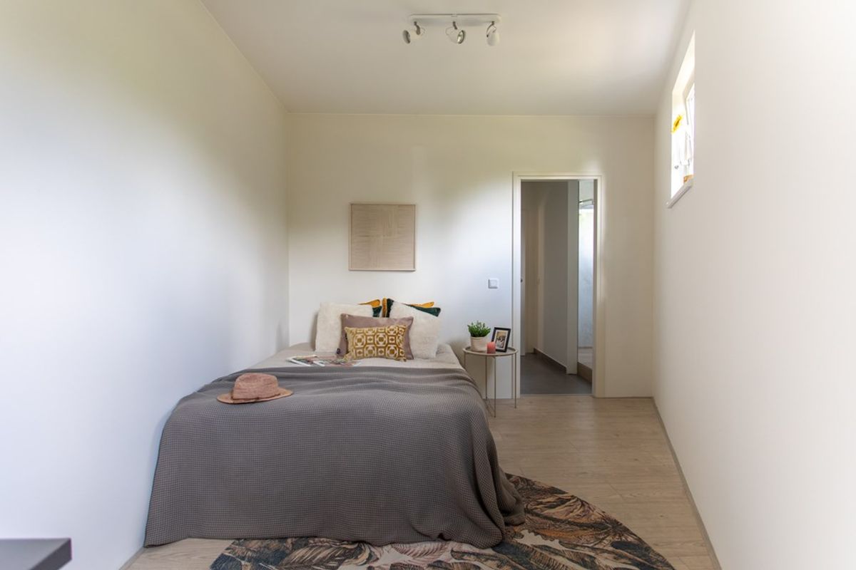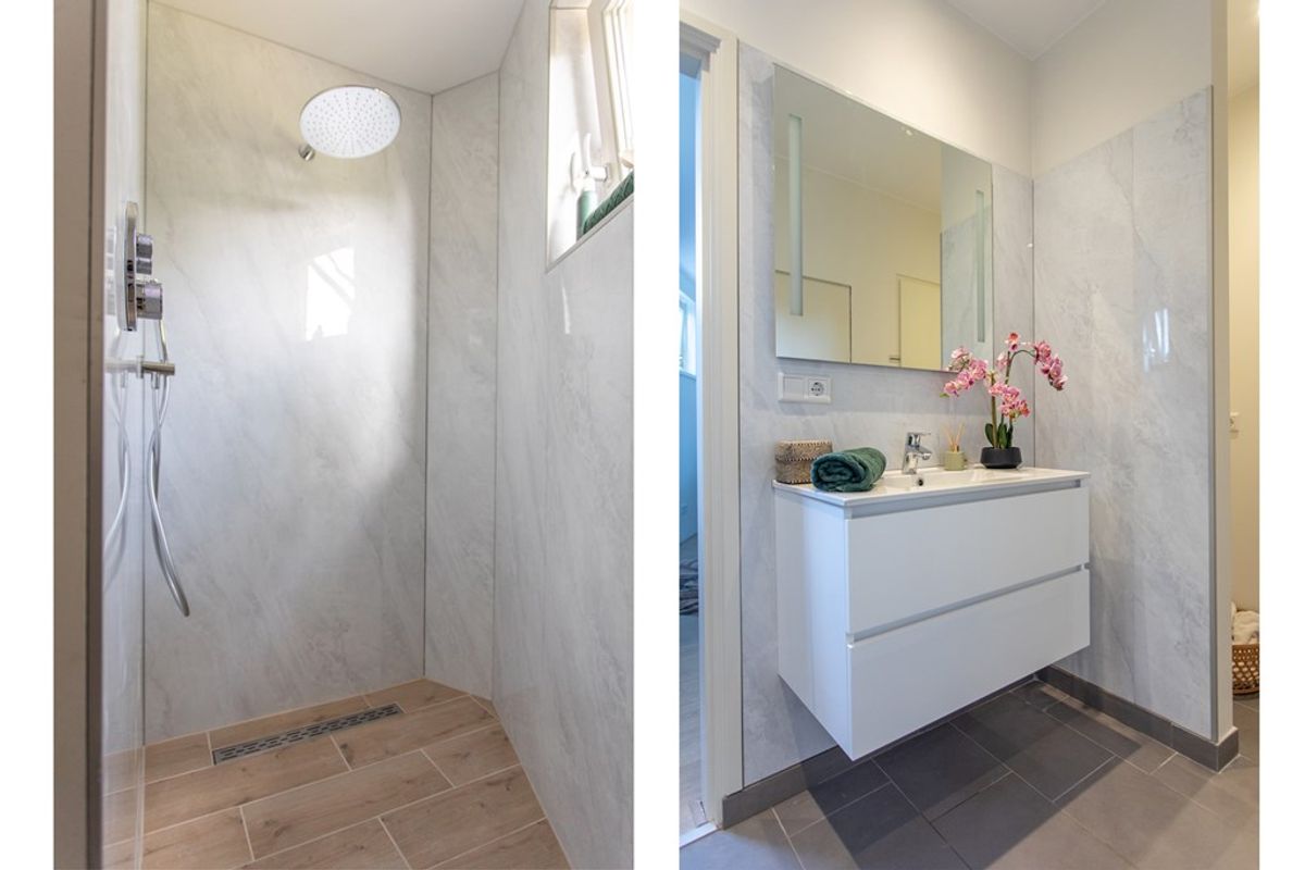 De badkamer oogt hotelwaardig: een ruime inloopdouche met regendouche en handdouche, marmerlook wanden, een strak verwerkte rvs-lijnafvoer en een houtlook douchevloer die warmte toevoegt. Het zwevende, greeploze wastafelmeubel met brede spiegel en geïntegreerde verlichting maakt het af; alles piekfijn onderhouden en fris. De slaapkamer is sereen en minimalistisch, met een lichte houtlook vloer, strak schilderwerk en plafondspots. Compact, maar functioneel en prettig stilgelegen.