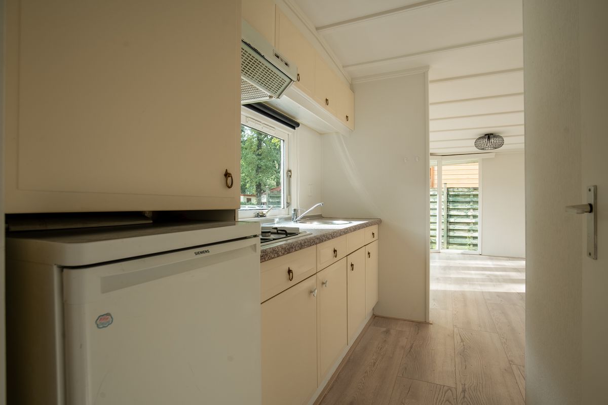 De half open keuken is voorzien van een koelkast met vriesvakje en gaskookplaat met afzuigkap.