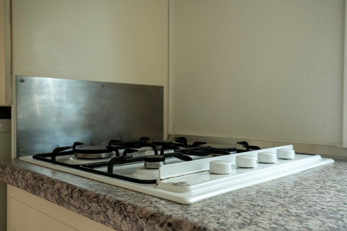 The semi-open kitchen is equipped with a refrigerator (with freezer compartment) and a gas hob with extractor hood.