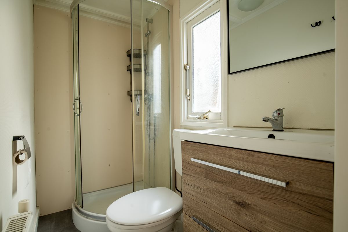 De badkamer is voorzien van een hoekdouche, wastafel + meubel en toilet.