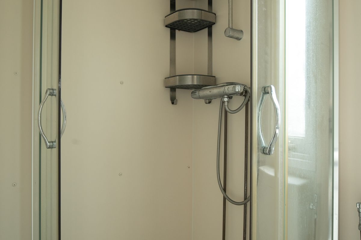 The bathroom includes a corner shower, washbasin with cabinet, and toilet.