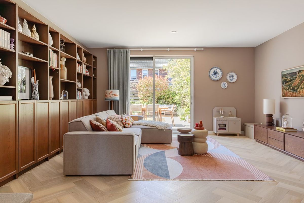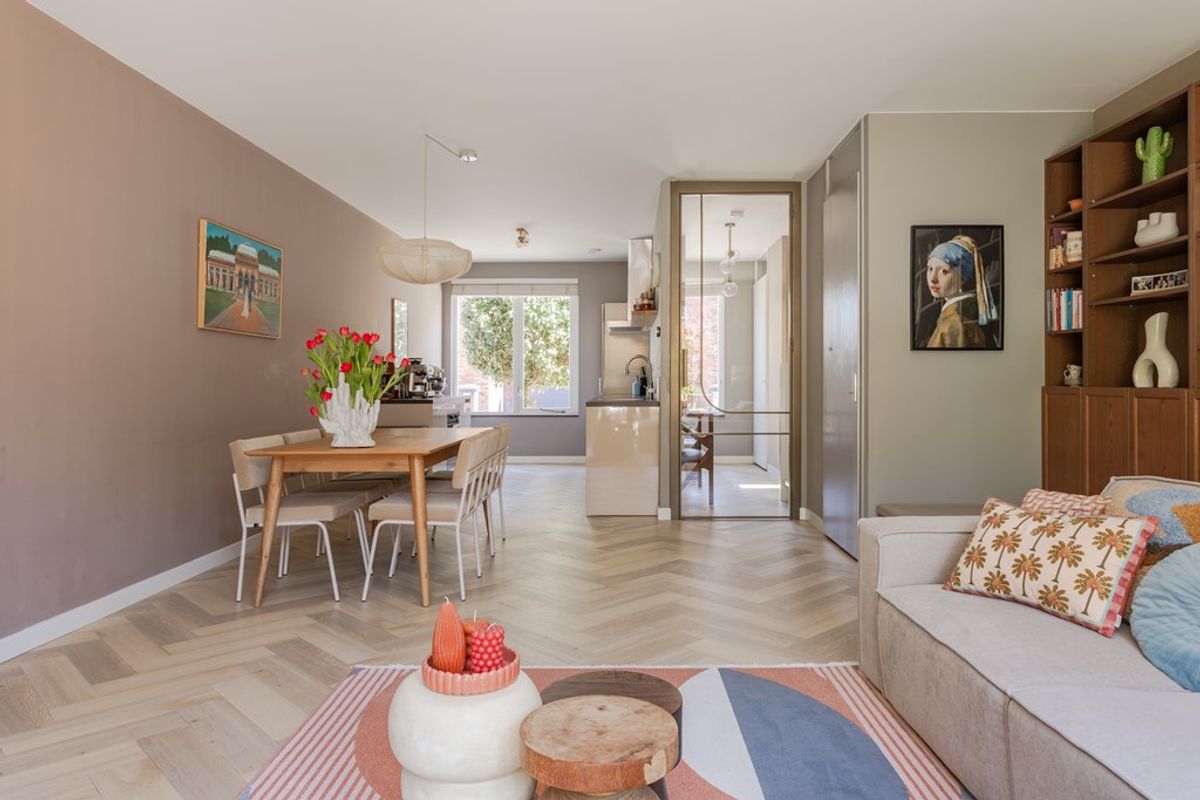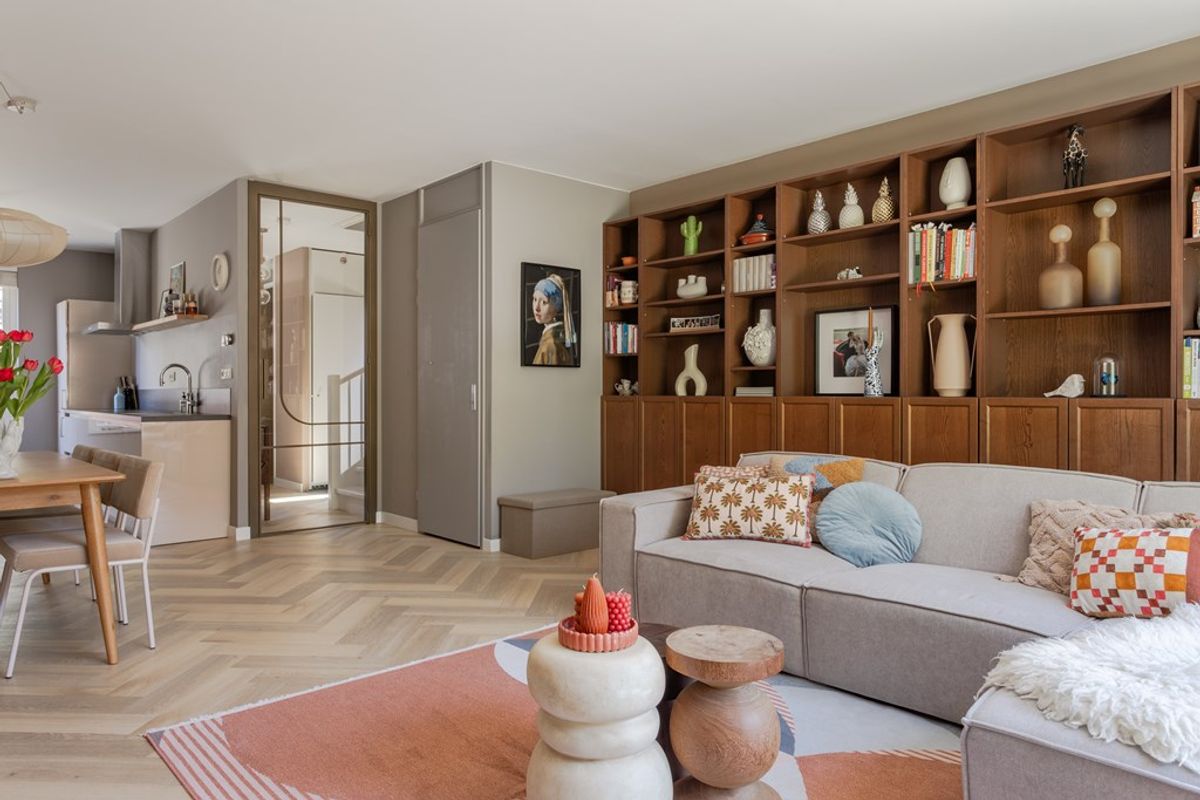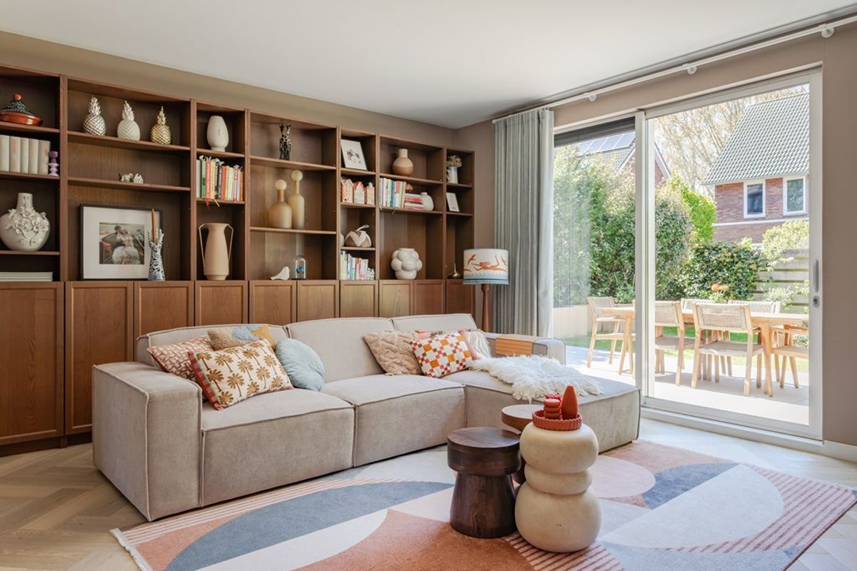 Fijne tuingerichte living met een kunststof schuifpui met HR++ glas en ventilatierooster naar de zonnig gelegen tuin. Alle wanden en het plafond zijn strak gestuukt en een lichte pvc-vloer in visgraad gelegd met vloerverwarming, wat ook de hoofdverwarming is, zorgt voor warme voeten. De diepe en praktische trapkast heeft verlichting en hier is de pvc-vloer ook doorgelegd.