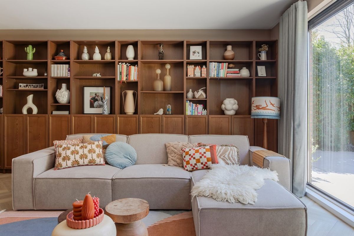 Moderne keuken in warme kleurstelling, uitgevoerd in hoogglans met veel kastruimte en laden, geïntegreerde besteklade en veel werkblad. Zoals te verwachten is er de nodige inbouwapparatuur, zoals: de koel/vriescombinatie, inductie kookplaat, rvs-afzuigkap met de afvoer naar buiten, vaatwasser, Quooker en een grote heteluchtoven. Boven het werkblad is een houten plank met bladverlichting geplaatst om wat spullen op te zetten. Staat erg gezellig!