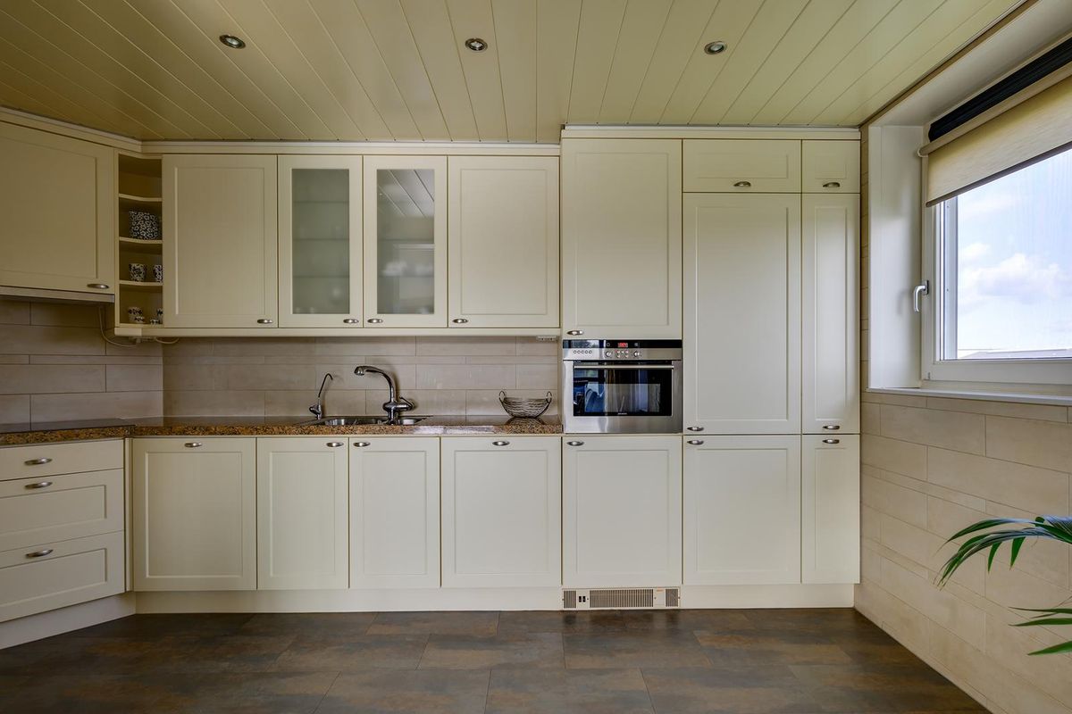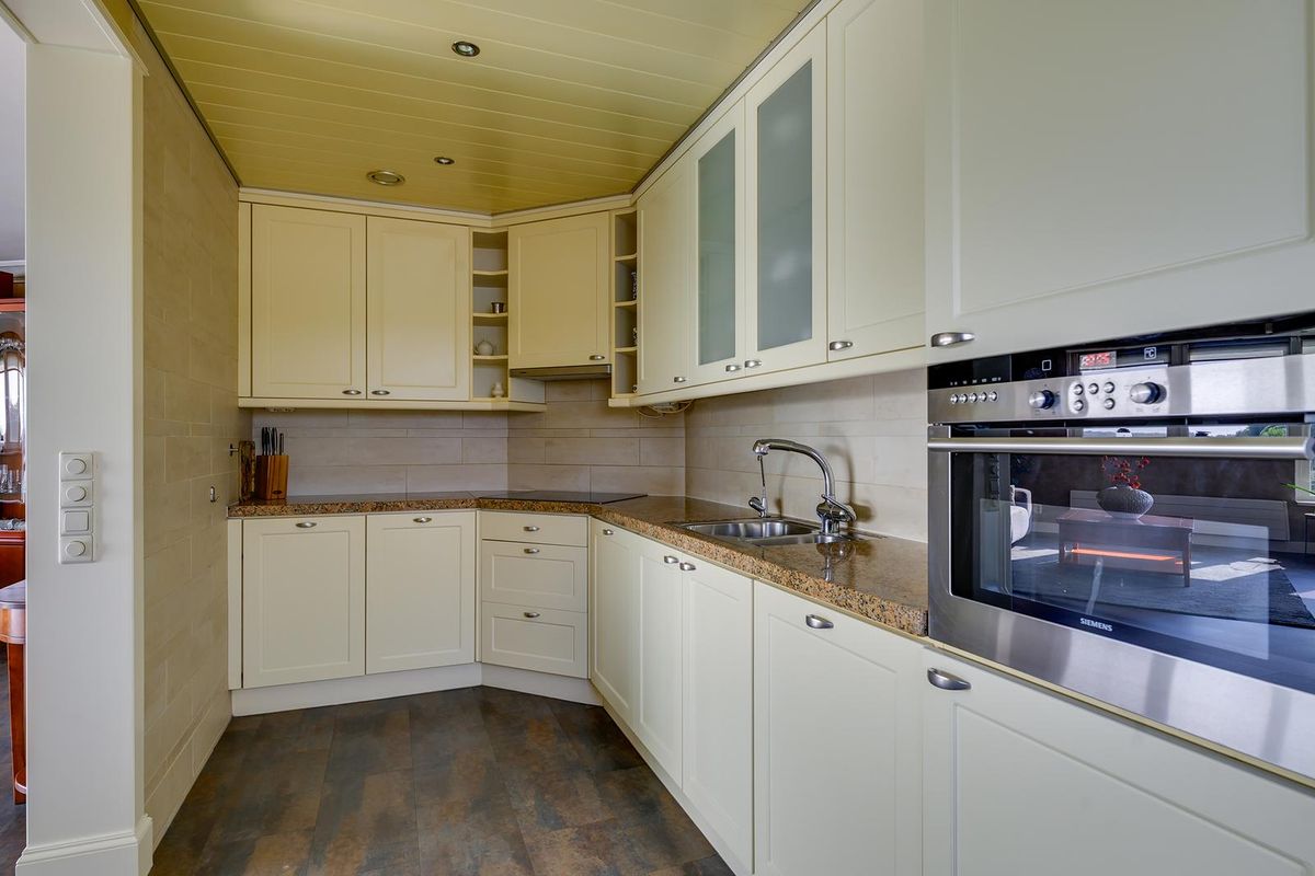 De open keuken is ruim van opzet, heeft een L-vormige opstelling en beschikt over een inductie kookplaat met afzuigkap, combi-oven, vaatwasser, spoelbak, apothekerskast en een koel-/vriescombinatie.