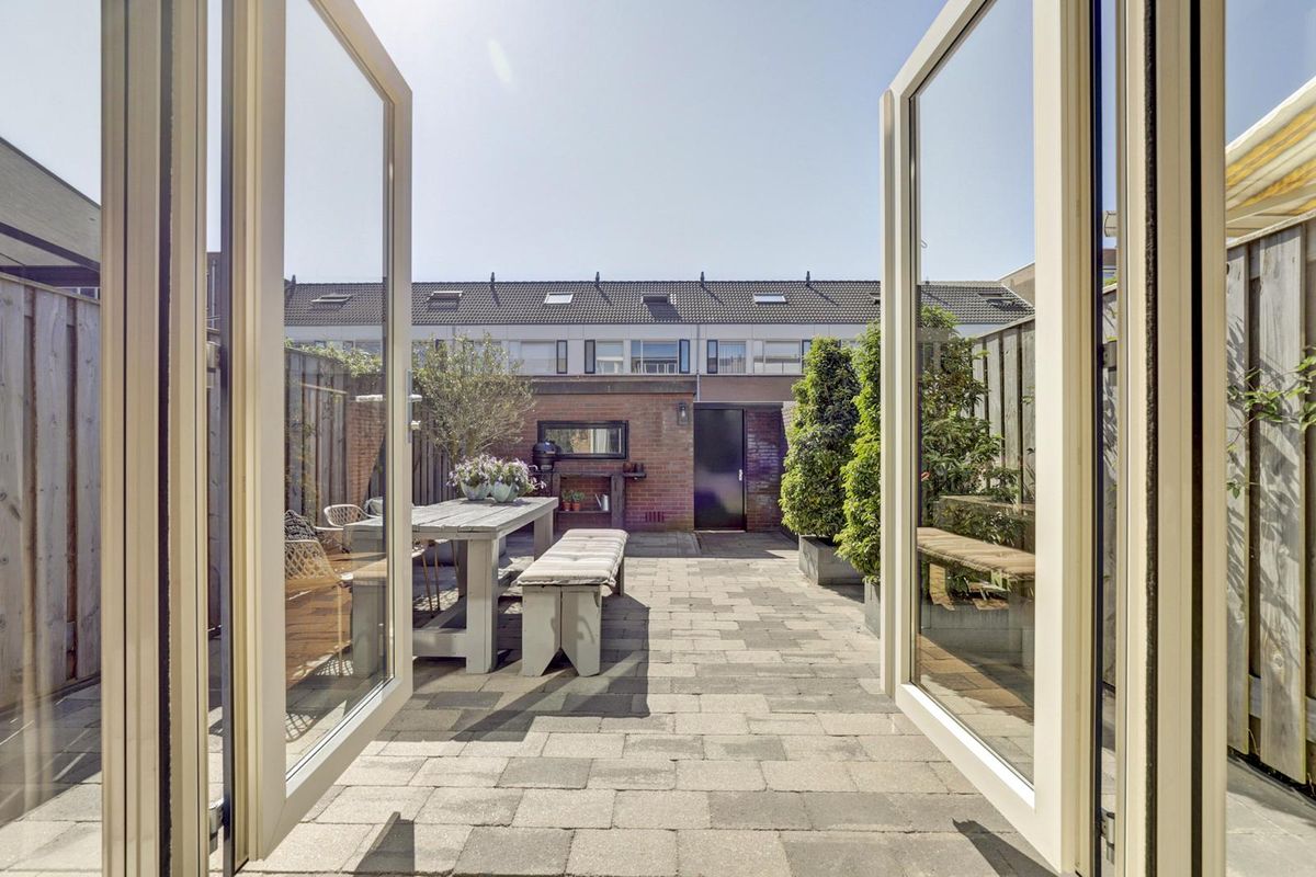 De achtertuin op het zuidwesten is een heerlijke plek om te ontspannen. Door de openslaande deuren loop je zo vanuit de woonkamer naar buiten en geniet je van zon tot in de avond.