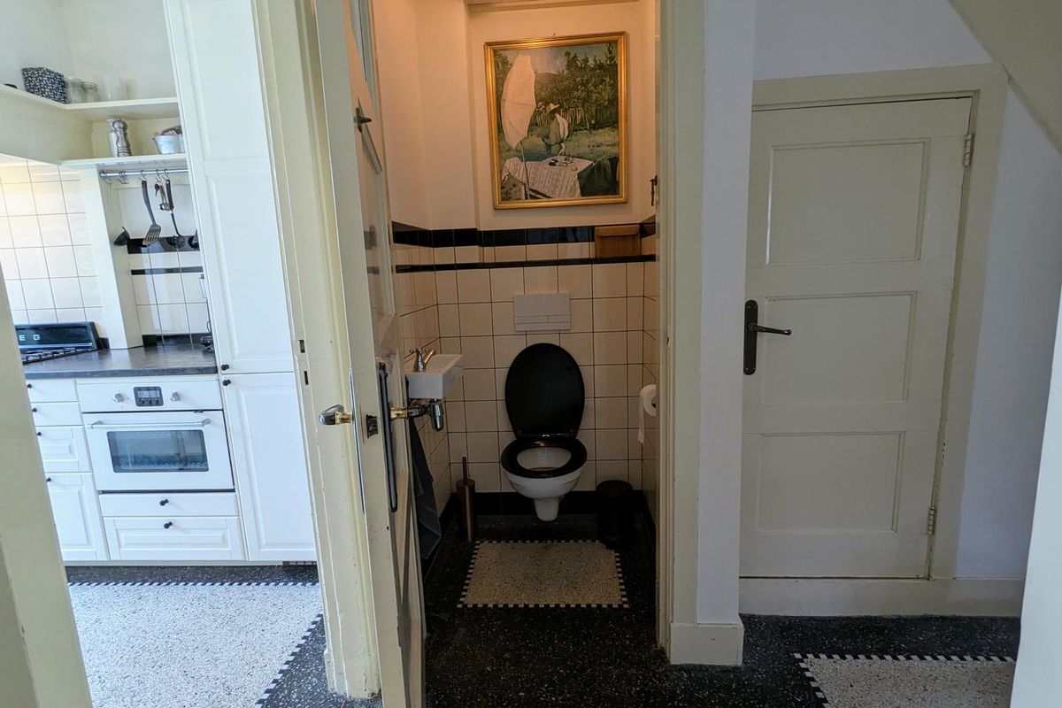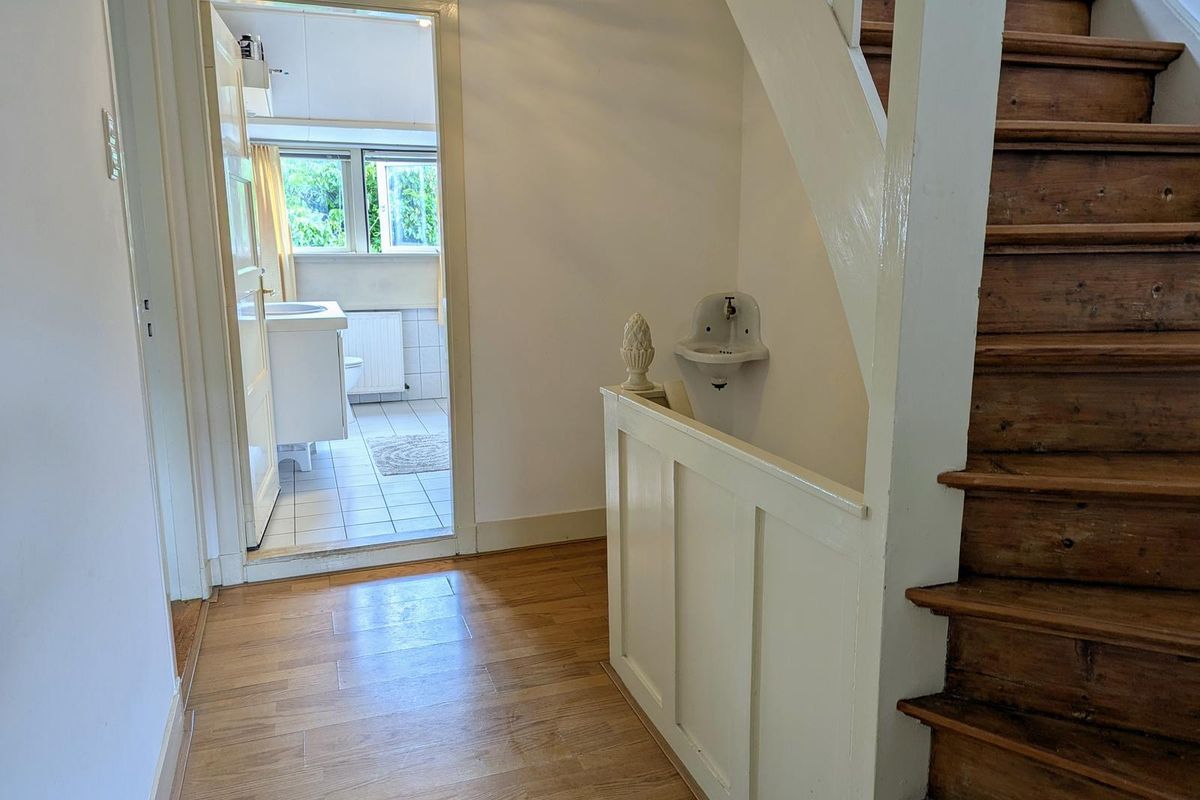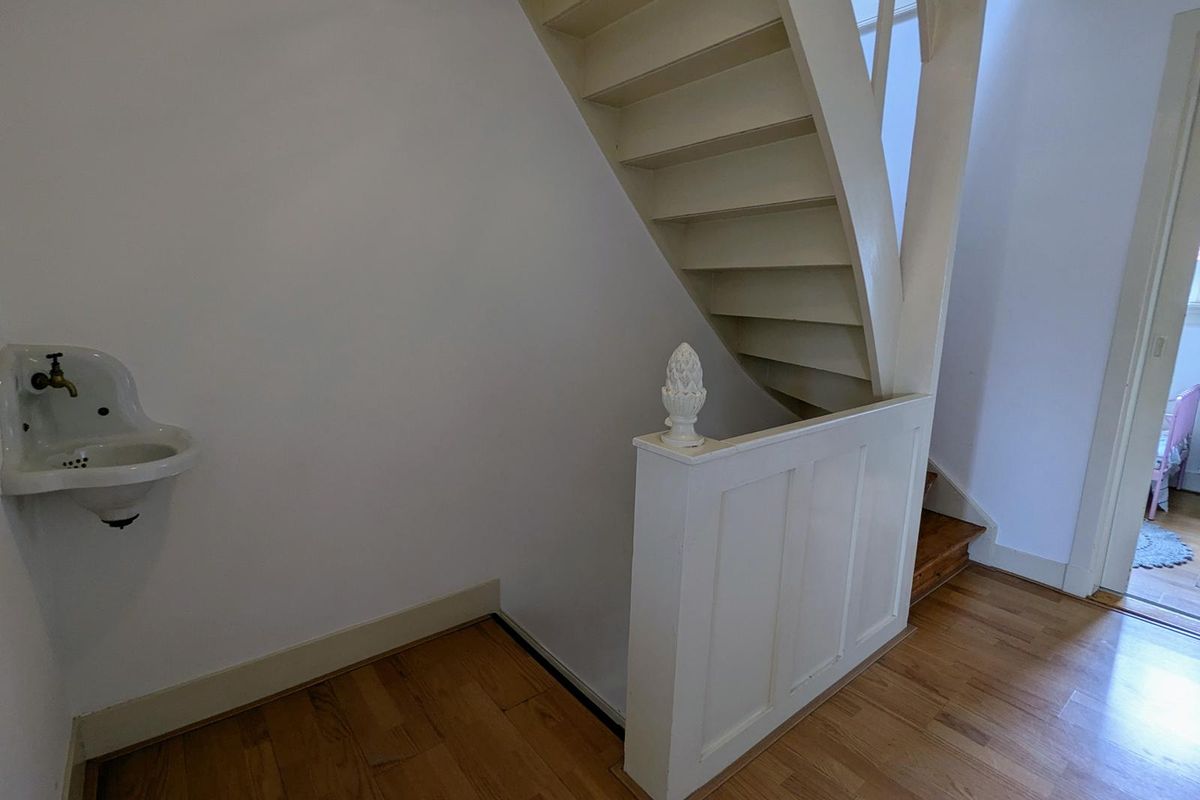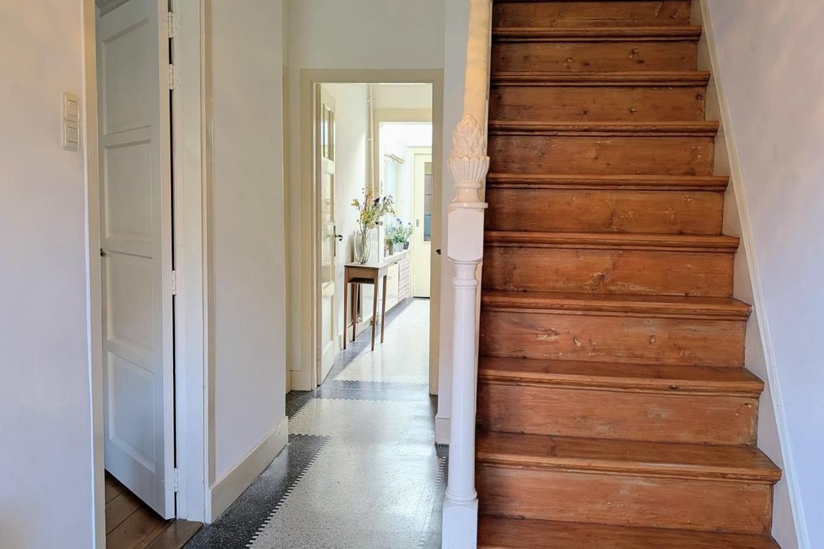 Via de houten trap, met originele trapornamenten, bereik je de eerste verdieping. Op de overloop bevindt zich een charmant, authentiek wastafeltje (buiten gebruik), dat direct bijdraagt aan de jaren ’30 sfeer.