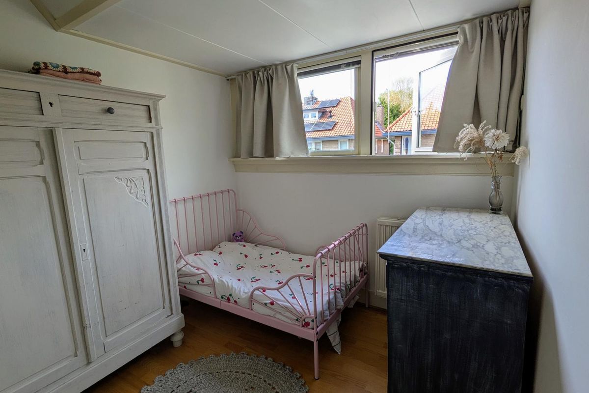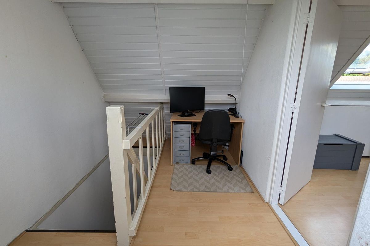 De zolderverdieping is bereikbaar via een mooie vaste trap. De overloop met dakraam biedt voldoende ruimte voor een bureau en er is bergruimte onder het schuine dak.