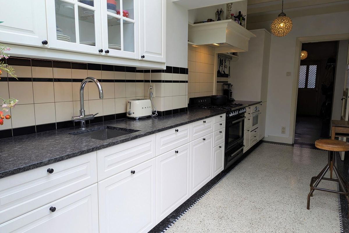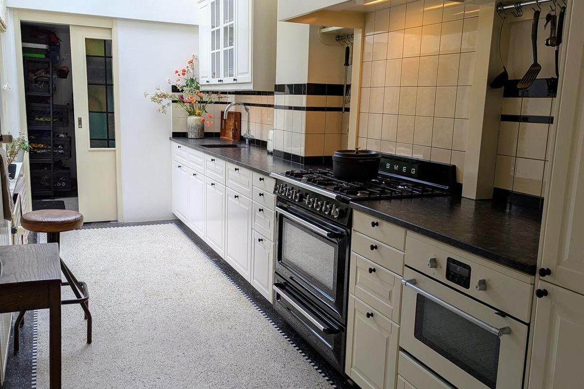 Loop je rechtdoor vanuit de hal, dan kom je via een tweede doorgang in de achterkamer voorzien van grote schuifpui. Vervolgens leidt de gang verder naar de ruime, moderne keuken, voorzien van diverse inbouwapparatuur en een kokend waterkraan. Aansluitend bevindt zich de praktische bijkeuken met een extra toegang tot de tuin.