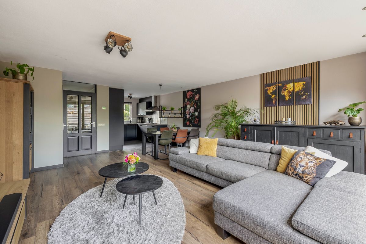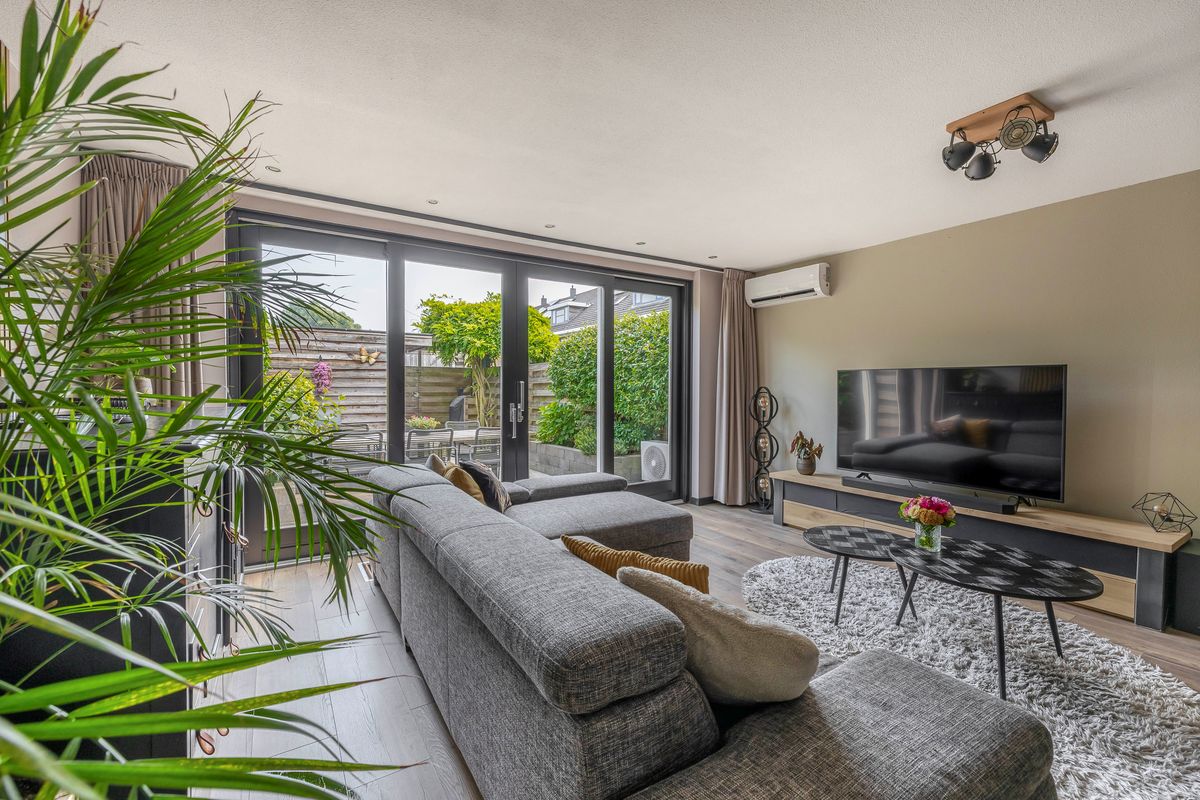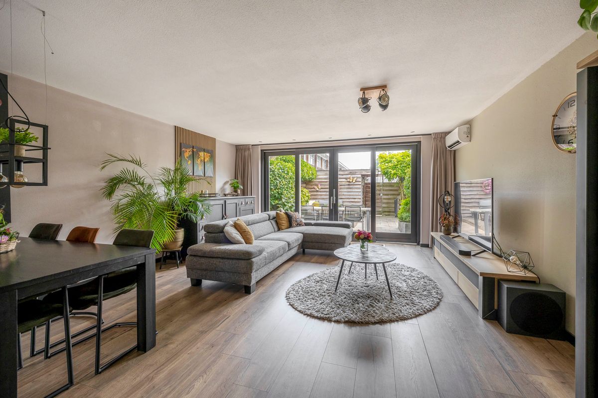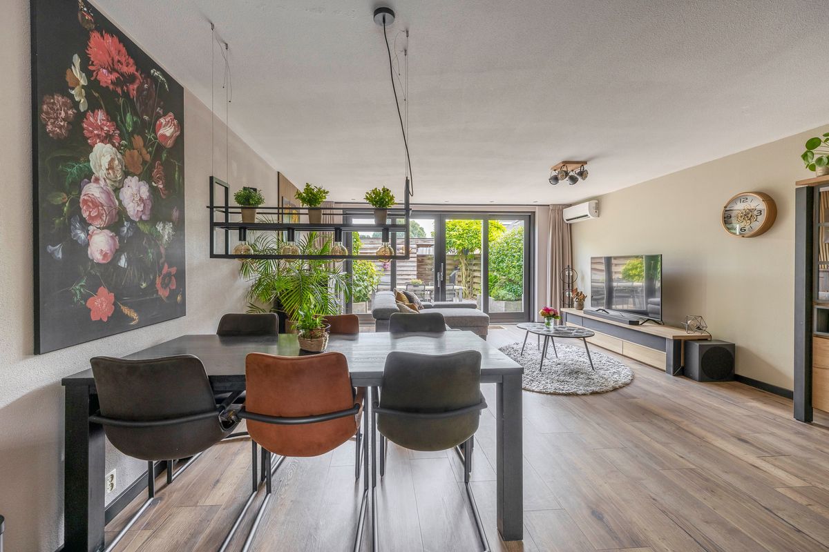 Via de voortuin kom je binnen in de ruime hal met garderobe, meterkast en toilet met fonteintje. Ook de trapopgang naar de eerste verdieping bevindt zich hier. De uitgebouwde woonkamer is een echte eyecatcher: de schuifpui en brede raampartijen zorgen voor een zee van licht en een fijne verbinding met de tuin. Er ligt een fraaie laminaatvloer, de convectorradiatoren zijn netjes weggewerkt en inbouwspots zorgen voor extra sfeer. Dankzij de praktische indeling is er volop plek voor een royale zithoek én een ruime eethoek. Extra comfort vind je hier dankzij de airconditioning die in 2024 is geplaatst en zowel kan koelen als verwarmen – ideaal voor energiezuinig gebruik in de winter.
