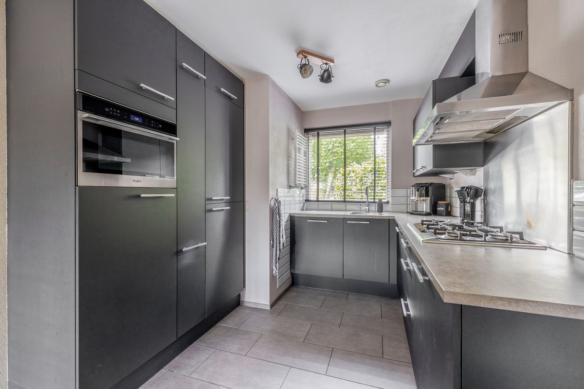 Aan de voorzijde ligt de keuken, netjes afgewerkt en voorzien van een 5-pits kookplaat, Whirlpool combimagnetron, koel-/vriescombinatie en voldoende kastruimte.