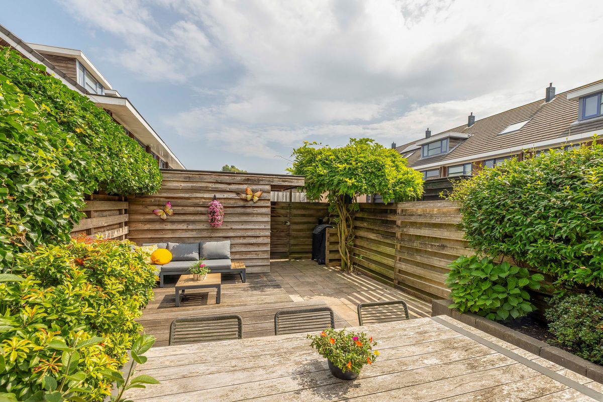 De tuin is netjes en onderhoudsvriendelijk aangelegd, met sierbestrating en een houten vlonder die zorgt voor een warme uitstraling. Achterin staat een praktische, vrijstaande houten berging die is voorzien van elektra. Via de achterom bereik je eenvoudig het achterliggende pad.