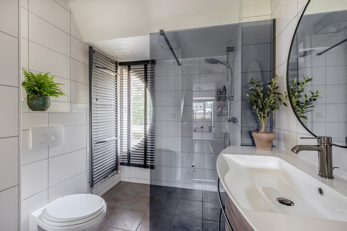 De badkamer is modern uitgevoerd en in 2024 deels vernieuwd, waardoor deze er verzorgd en eigentijds uitziet. De ruimte beschikt over een inloopdouche met glazen wand, een zwevend toilet, een stijlvol wastafelmeubel en een designradiator.
