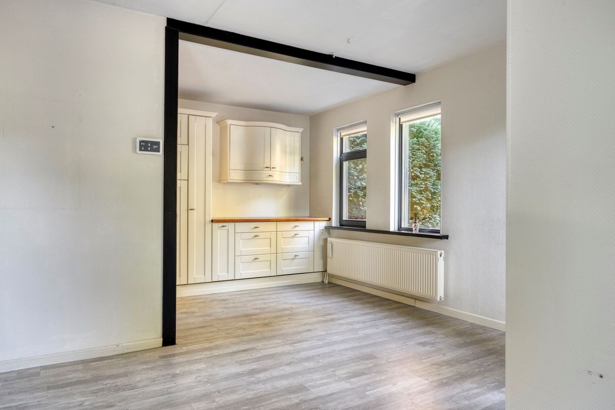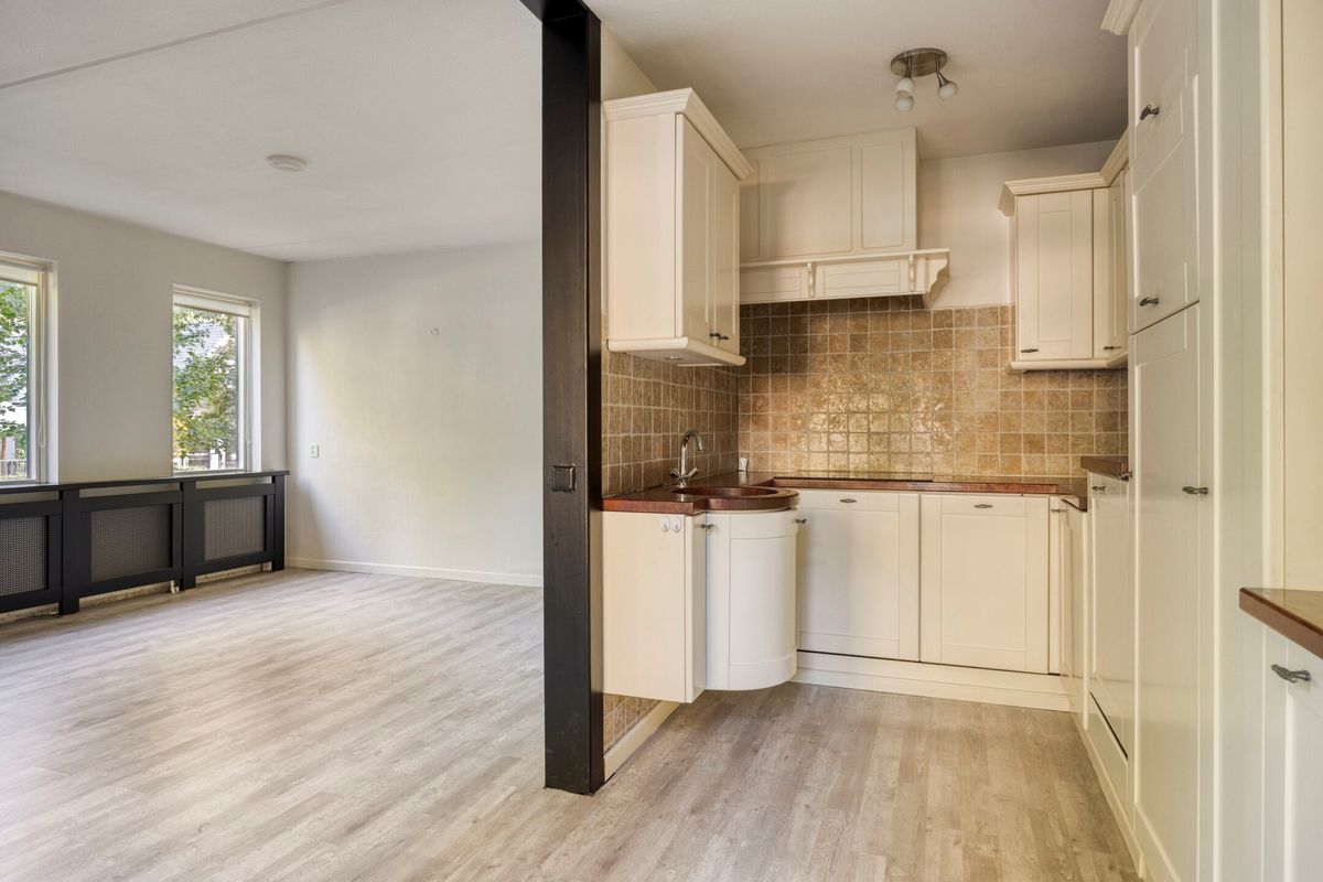 De woning heeft een lichte woonkamer met grote ramen en een royale halfopen keuken.