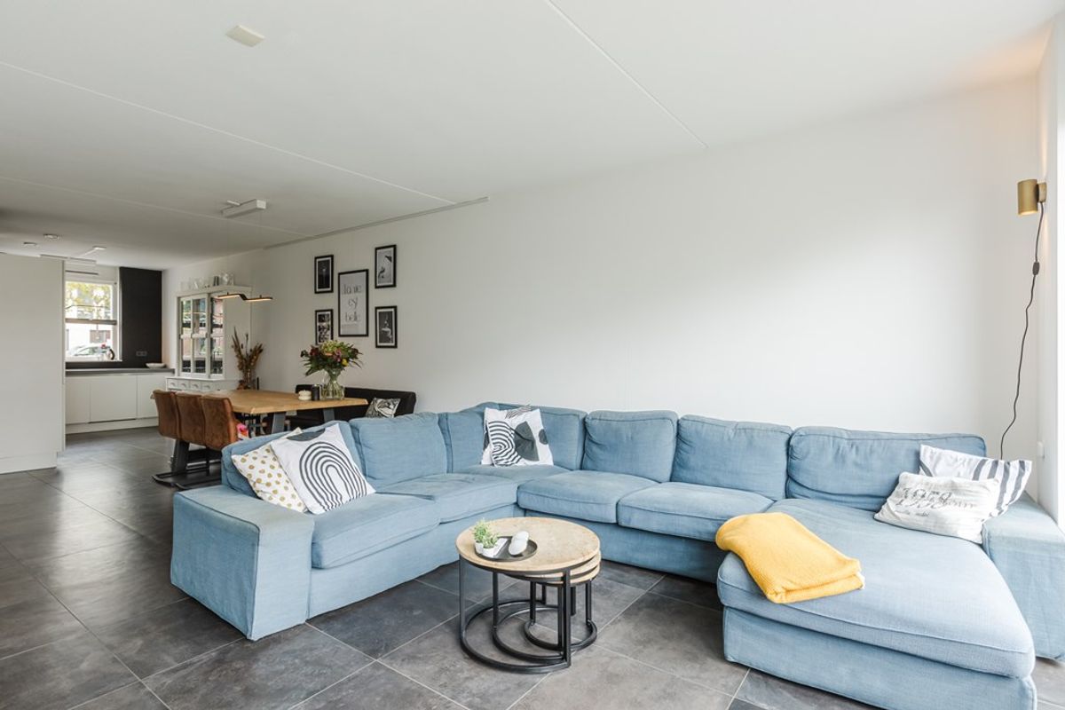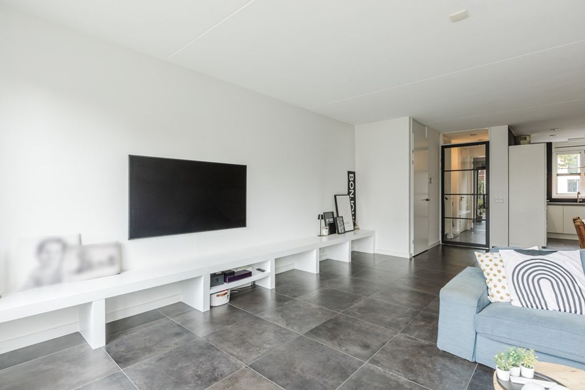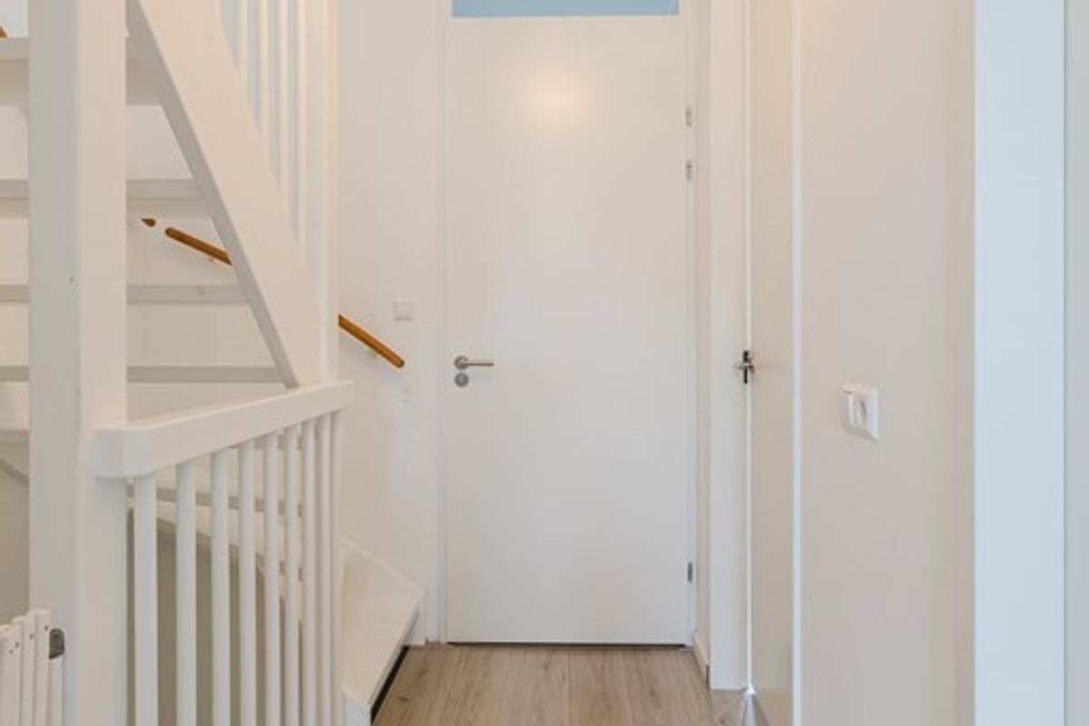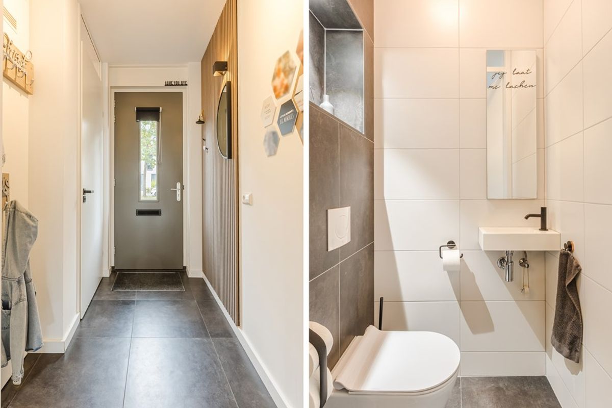 We komen binnen in de hal met meterkast (8 groepen en 3 aardlekschakelaars), trapopgang en modern toilet met fonteintje. Vanuit hier lopen we door naar de woonkamer — een lichte, prettige ruimte met trapkast en dubbele tuindeuren naar de achtertuin. De vloerverwarming zorgt voor aangenaam comfort, in combinatie met de goede isolatie en HR++-beglazing.