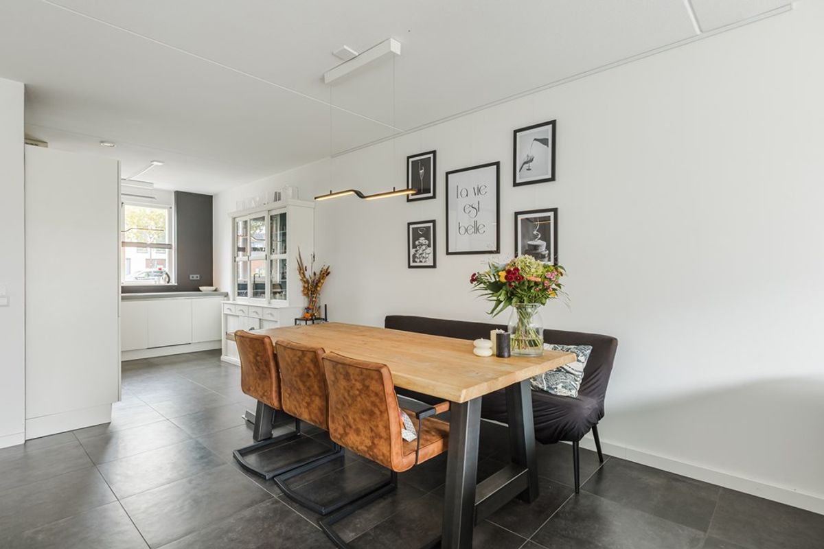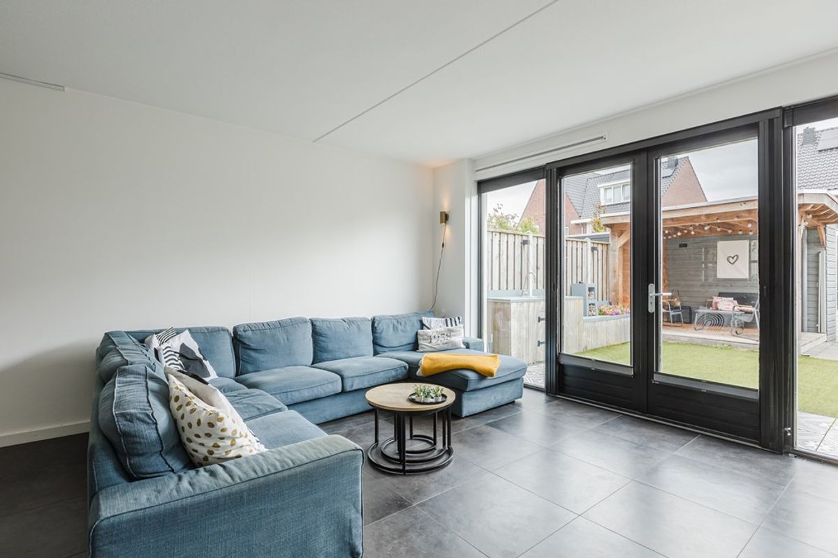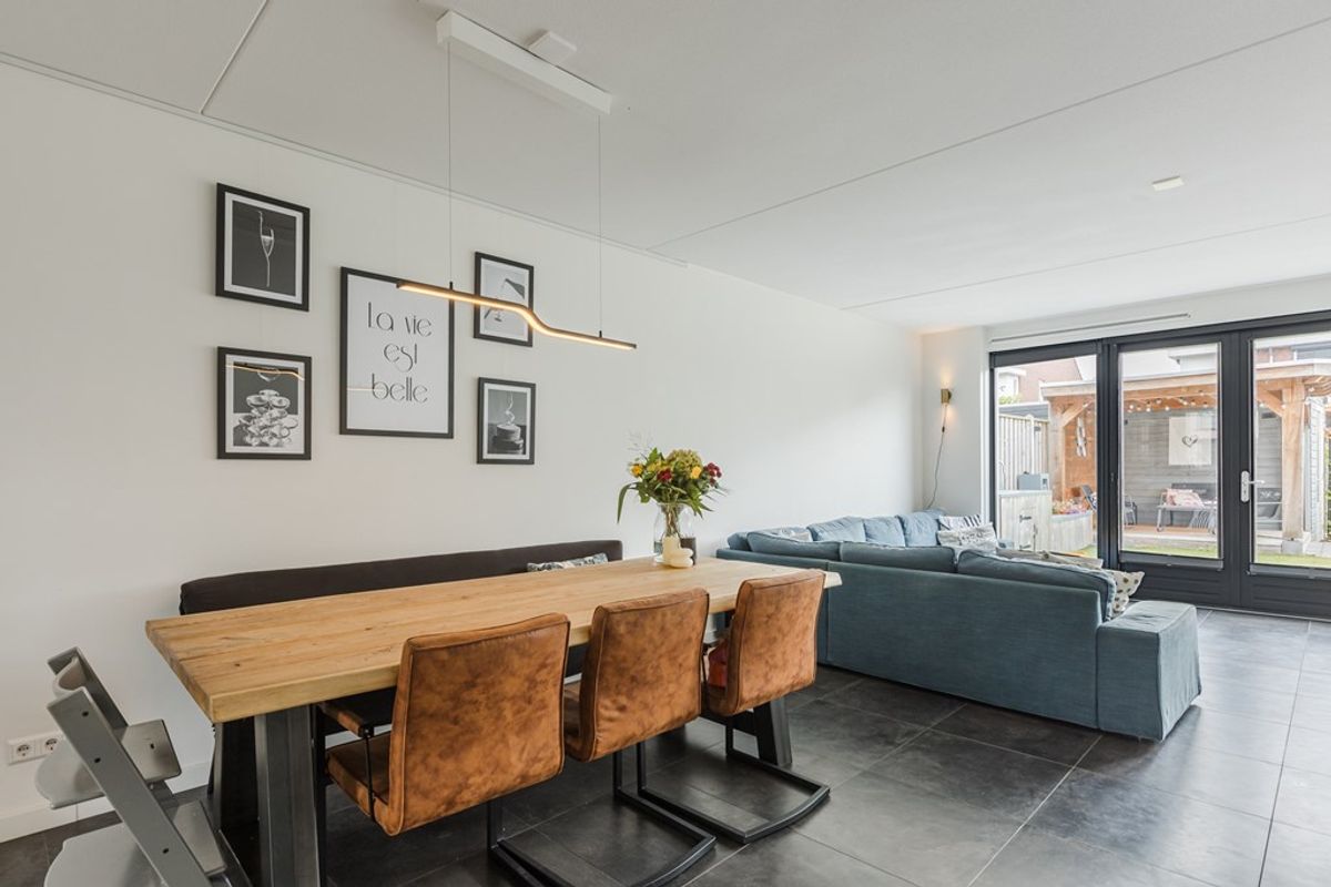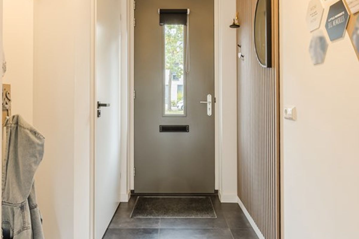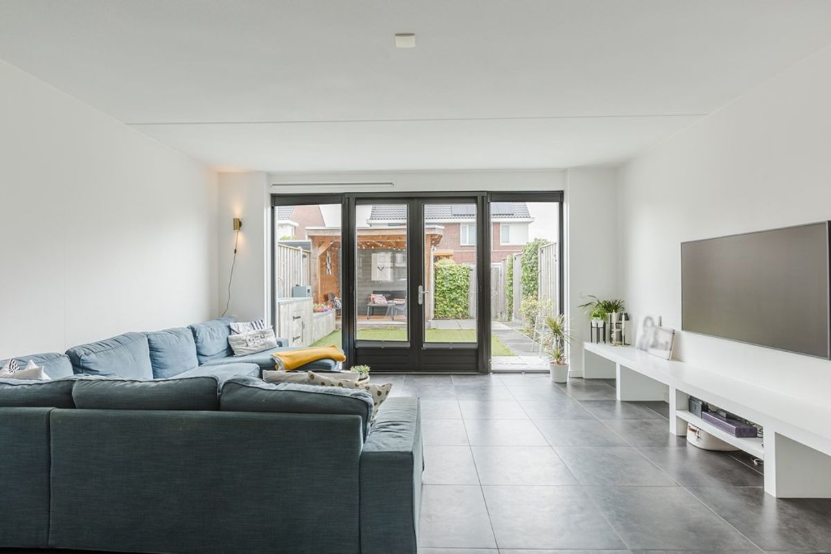 We komen binnen in de hal met meterkast (8 groepen en 3 aardlekschakelaars), trapopgang en modern toilet met fonteintje. Vanuit hier lopen we door naar de woonkamer — een lichte, prettige ruimte met trapkast en dubbele tuindeuren naar de achtertuin. De vloerverwarming zorgt voor aangenaam comfort, in combinatie met de goede isolatie en HR++-beglazing.