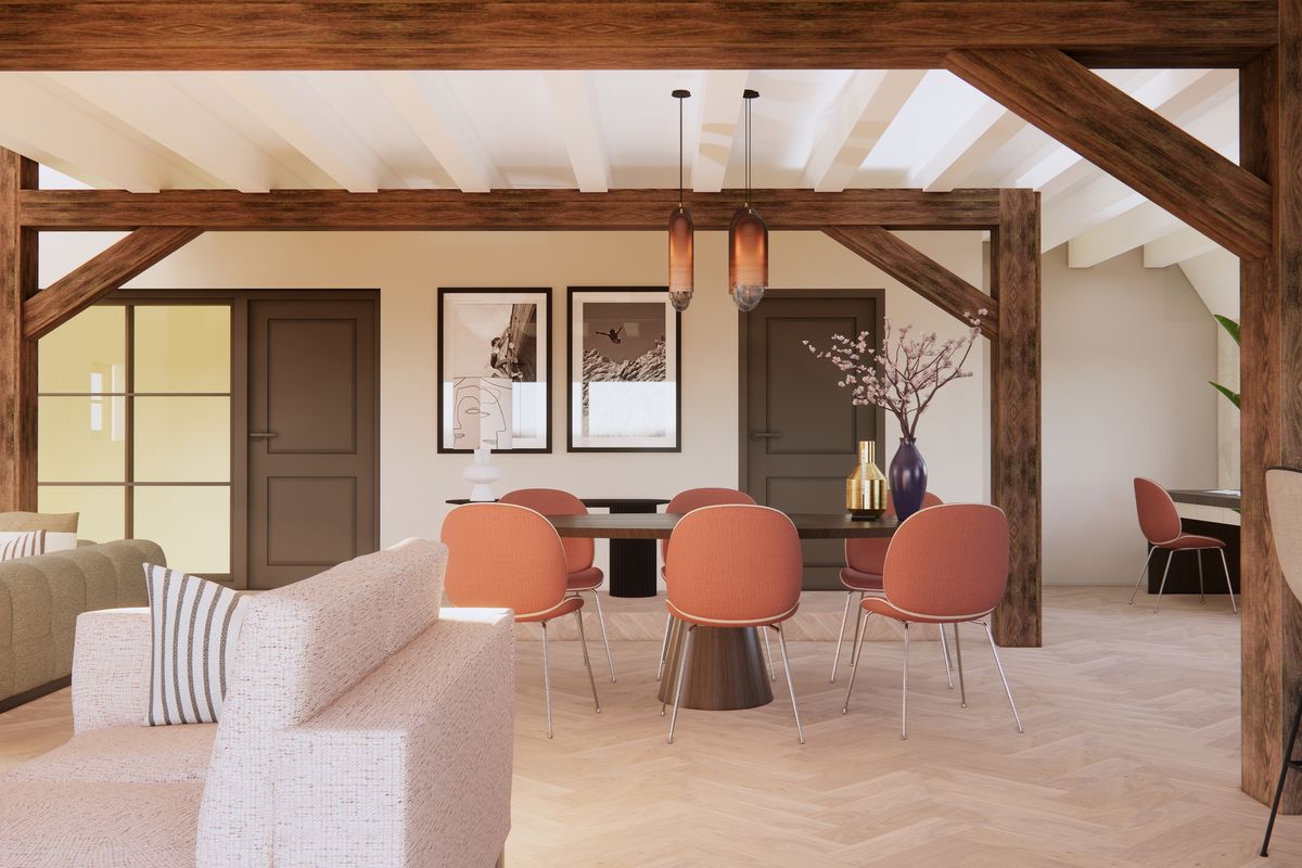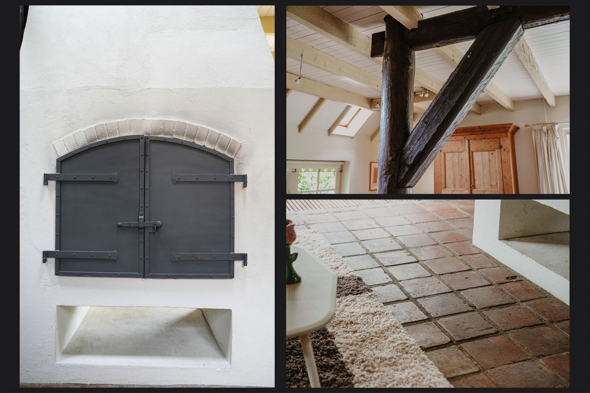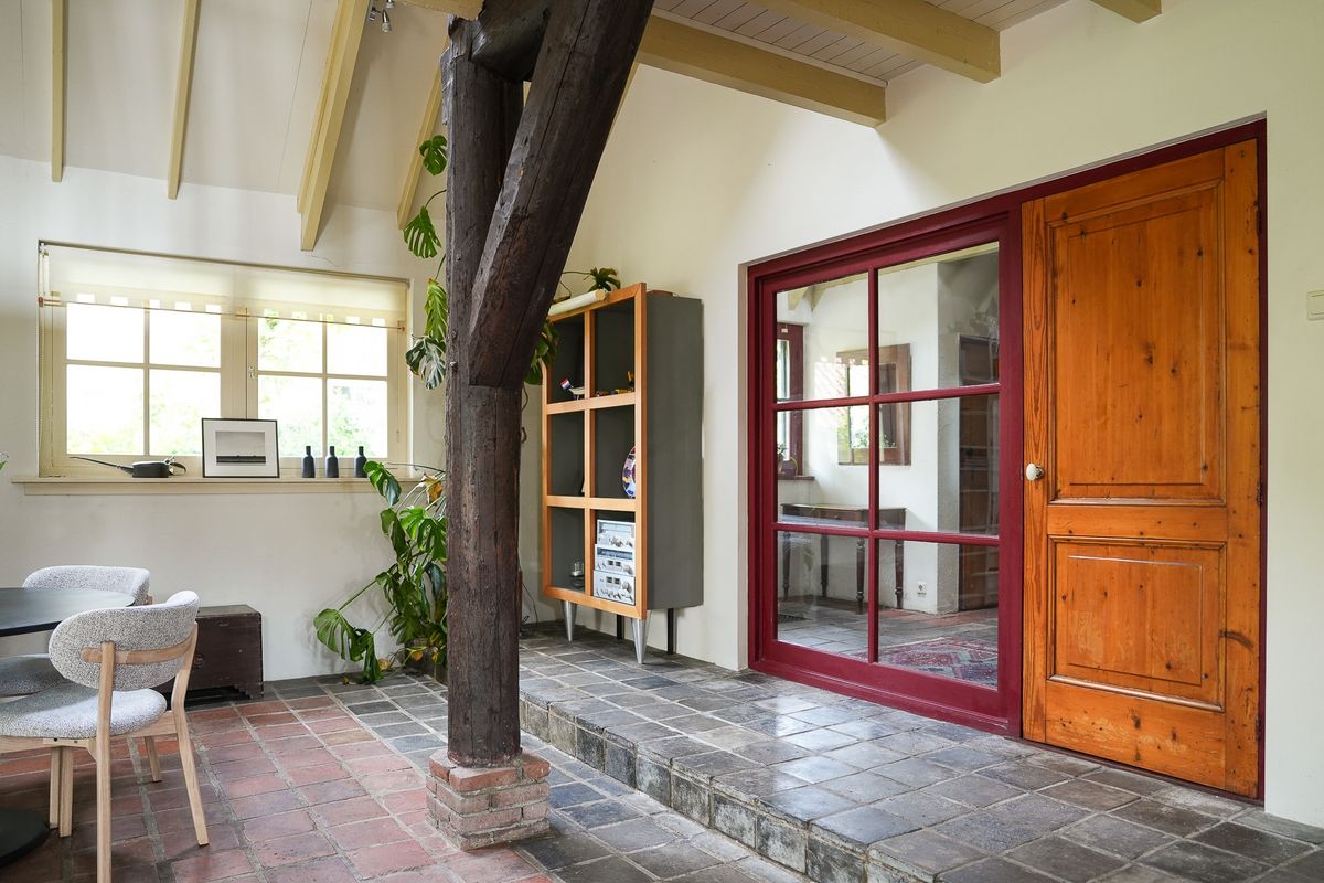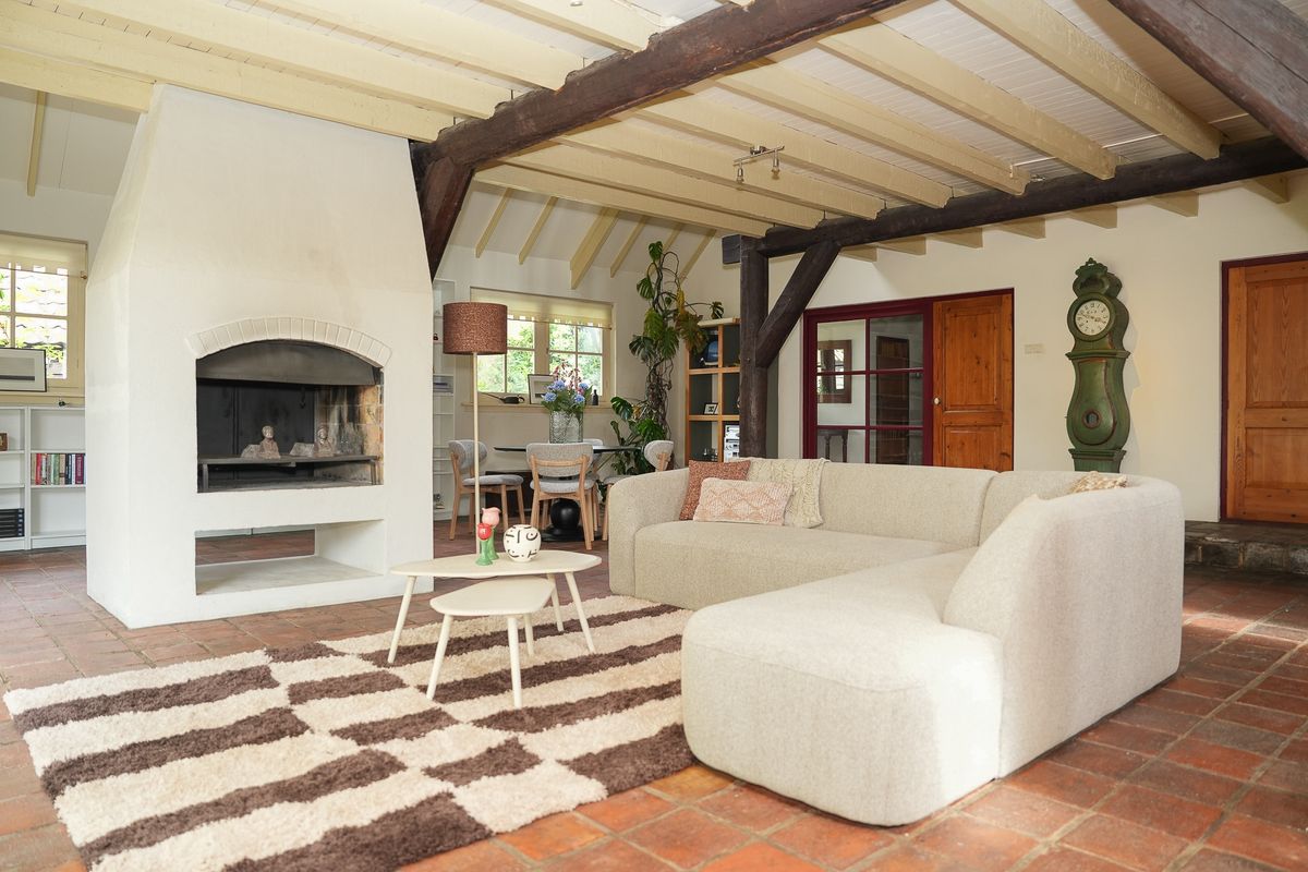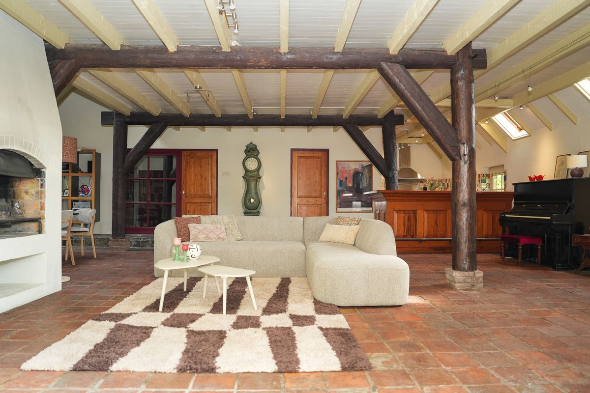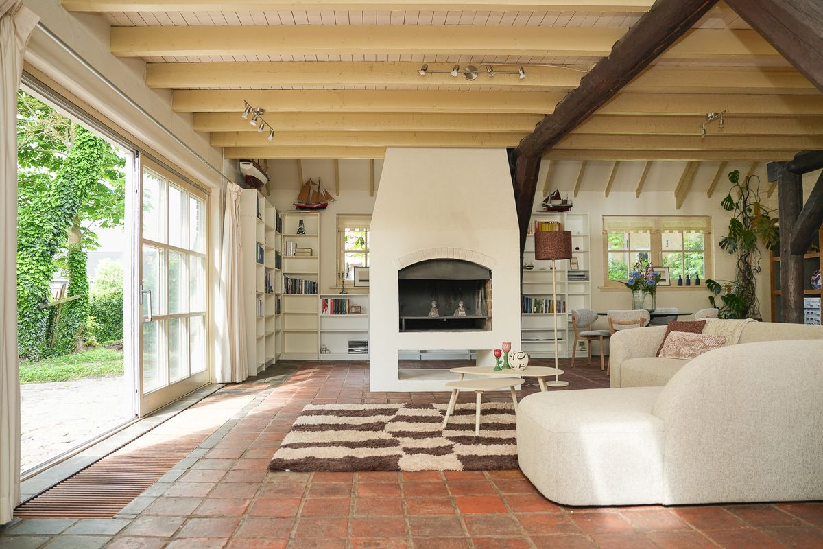 De voormalige deel is indrukwekkend opengebroken tot een leefruimte van 94 m² met een karakteristiek balkenplafond, houten spanten, een open haard en brede schuifpui naar het terras. De indeling is speels met een gezellige zithoek, eethoek en een open keuken.