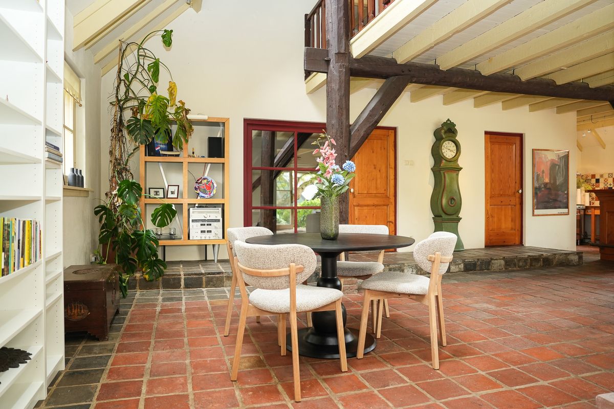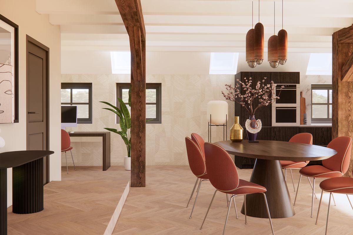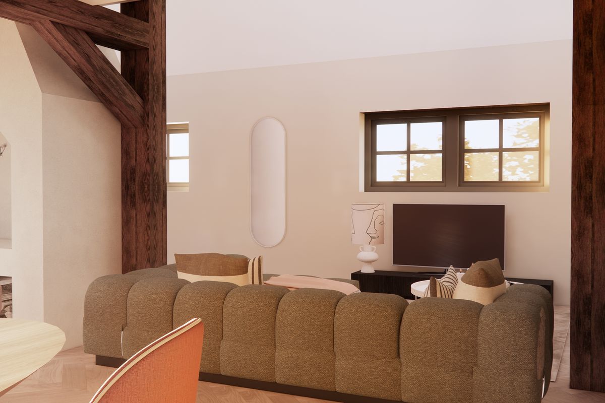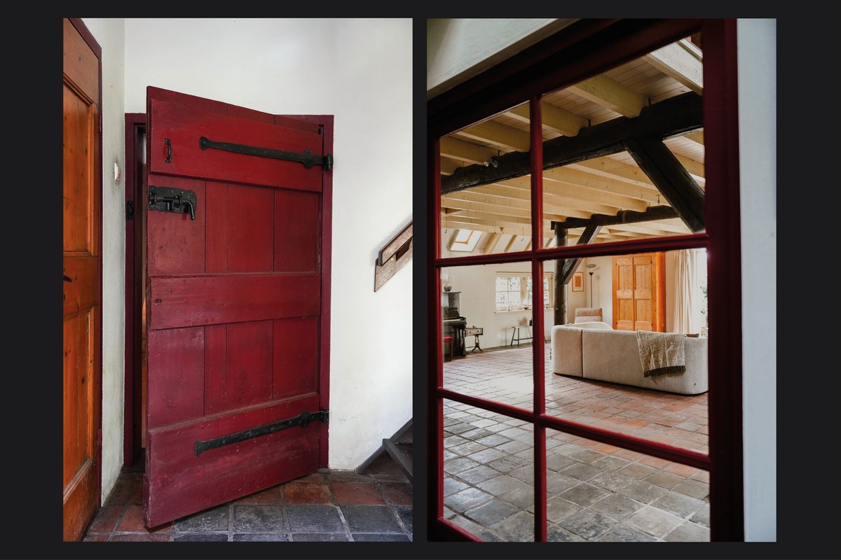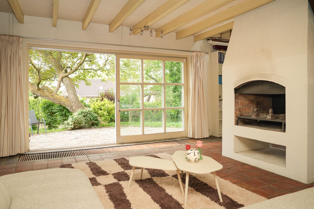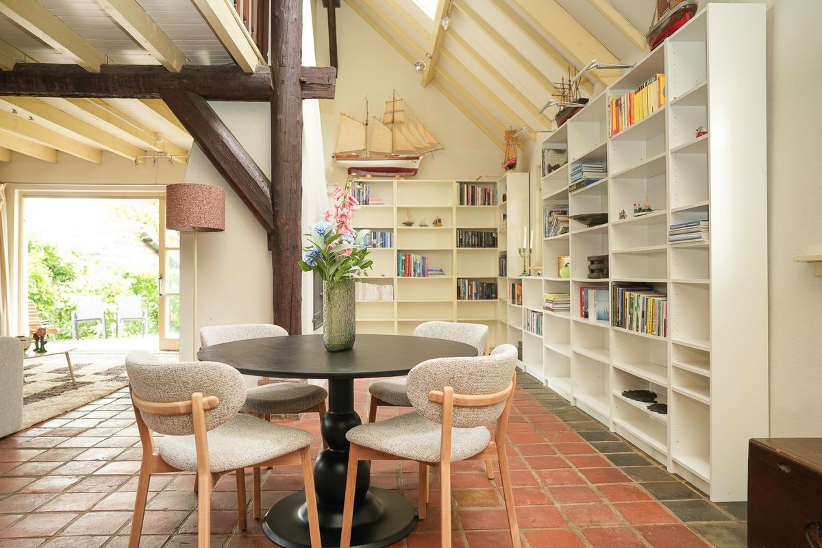 De voormalige deel is indrukwekkend opengebroken tot een leefruimte van 94 m² met een karakteristiek balkenplafond, houten spanten, een open haard en brede schuifpui naar het terras. De indeling is speels met een gezellige zithoek, eethoek en een open keuken.