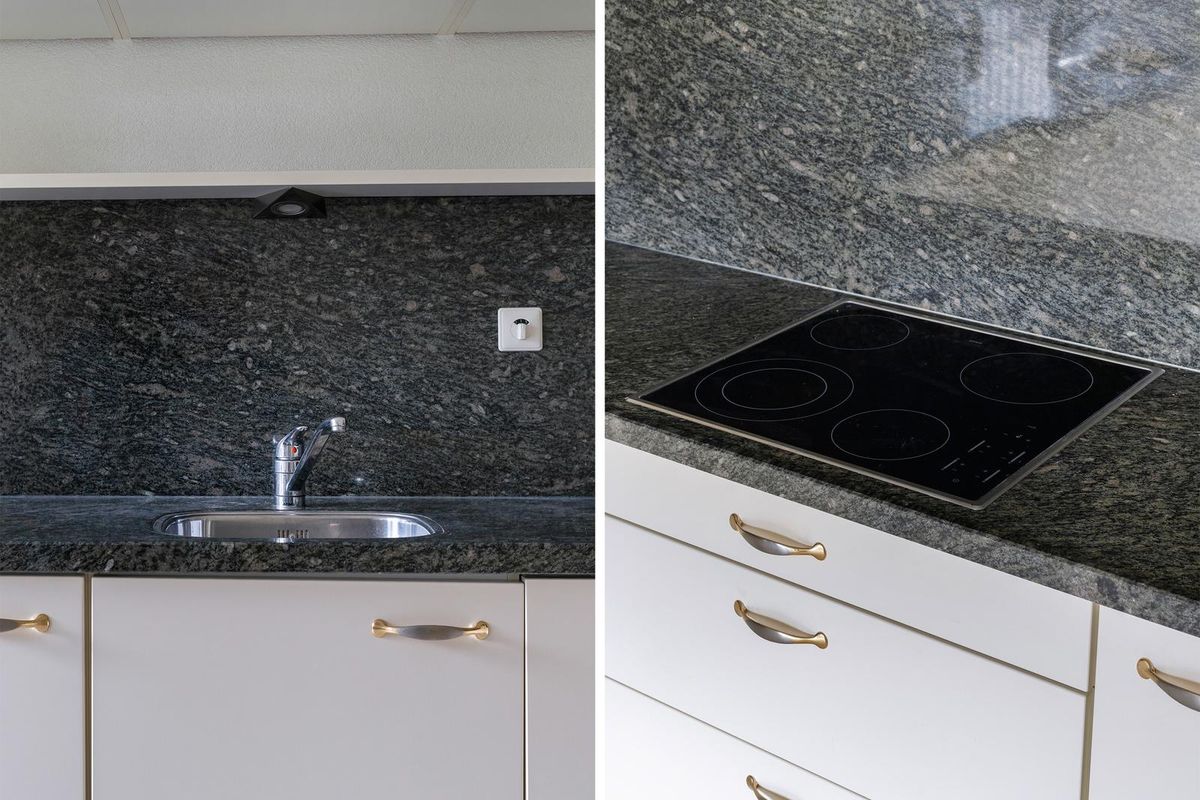 De open keuken sluit hier op aan en is uitgevoerd in een lichte kleurstelling met mooie, donkere natuurstenen werkblad en achterwand. Het apparatuur – waaronder een elektrische kookplaat, rvs-afzuigkap, vaatwasser, combimagnetron en koelkast – maakt koken hier een plezier. Vanuit de keuken stap je zo het zonnige terras op, gelegen op het zuiden, waar je tot in de avond kunt genieten van de zon en het uitzicht over het groen. De keukenruimte is voorzien van een fijne plavuizen vloer.