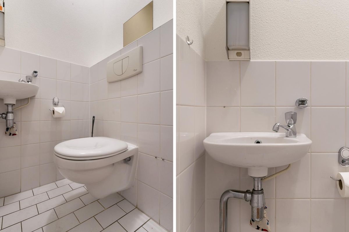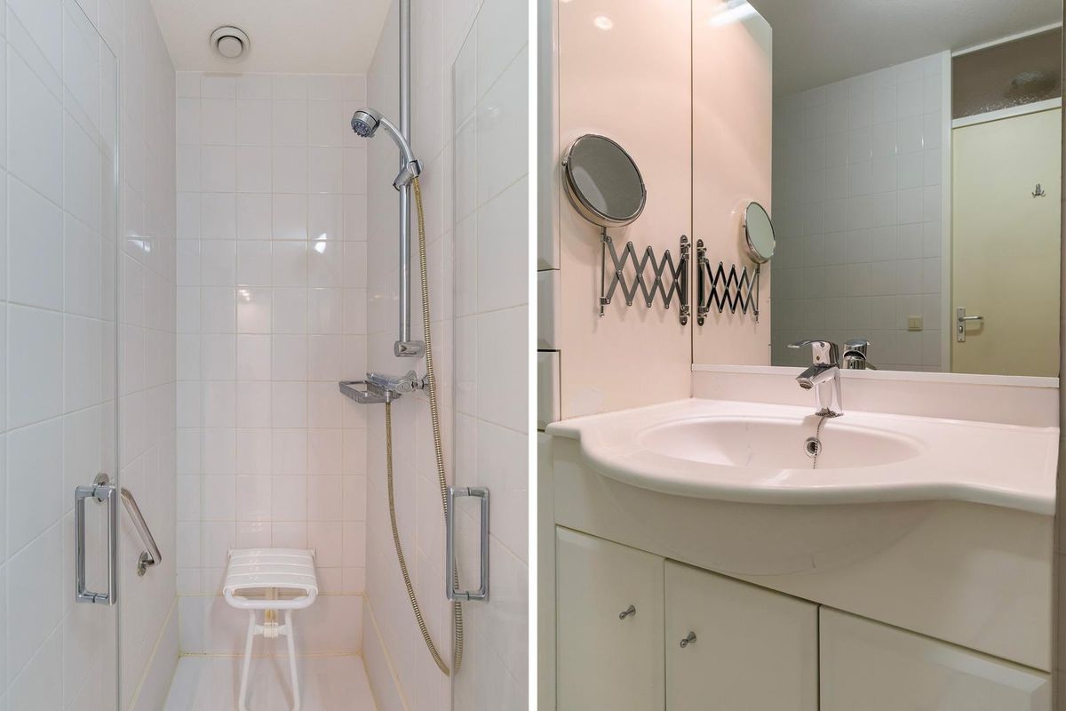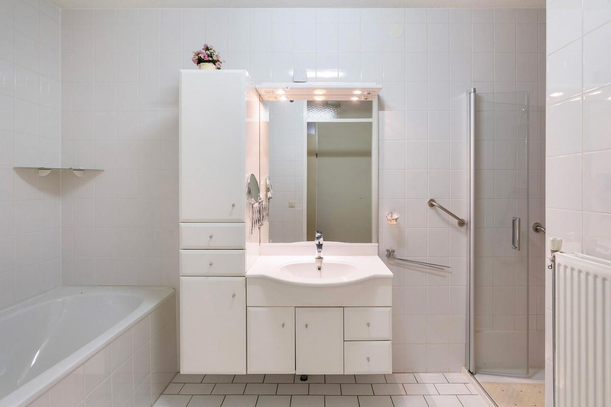 De hal leidt verder naar de separate toiletruimte, die keurig is afgewerkt met lichte tegels, een wandcloset en een fonteintje. Aansluitend vind je de verzorgde badkamer, volledig betegeld in een frisse witte tint. Hier kun je ontspannen in het ligbad of juist verkwikken onder de inloopdouche met glazen deuren. Het wastafelmeubel met grote spiegel, kastruimte en ingebouwde verlichting maakt het geheel compleet.