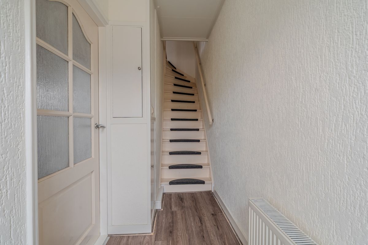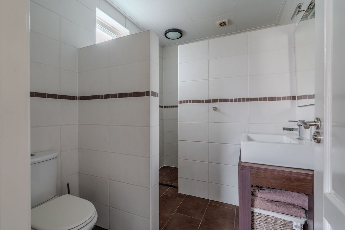 Aangrenzend bevindt zich de bijkeuken, voorzien van witgoedaansluitingen en de cv-opstelling. Vanuit de bijkeuken is de nette badkamer bereikbaar, uitgerust met een toilet, wastafel met meubel en een inloopdouche, waardoor functionaliteit en comfort optimaal gecombineerd worden.