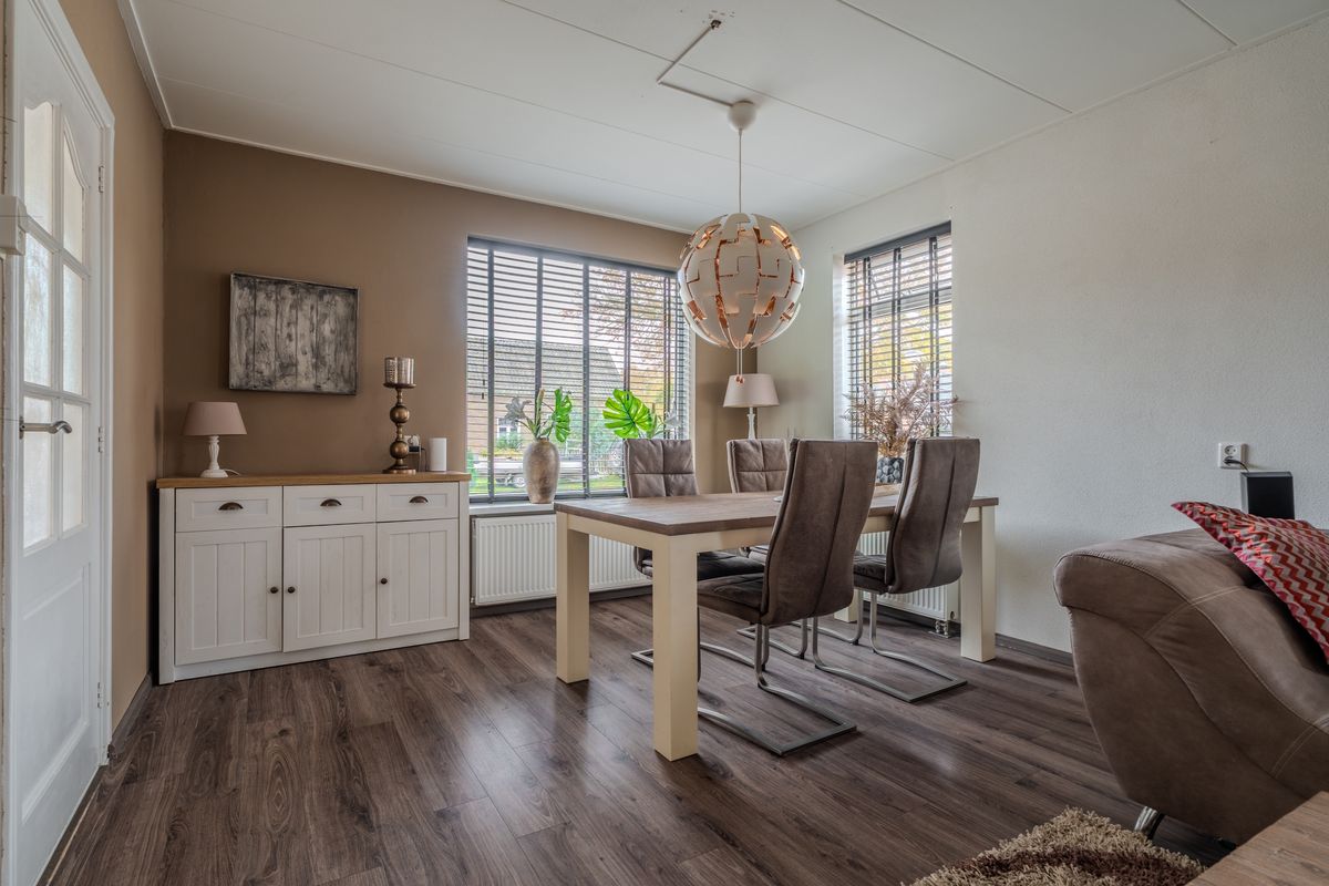 De voortuin is onderhoudsvriendelijk aangelegd met siergrind, plantenborders en sierbeplanting, wat direct een verzorgde indruk geeft. De oprit langs de woning biedt ruime parkeergelegenheid voor meerdere auto’s op eigen terrein. De vrijstaande stenen garage van circa 29,4 m² biedt volop ruimte voor een auto, fietsen en tuingereedschap.