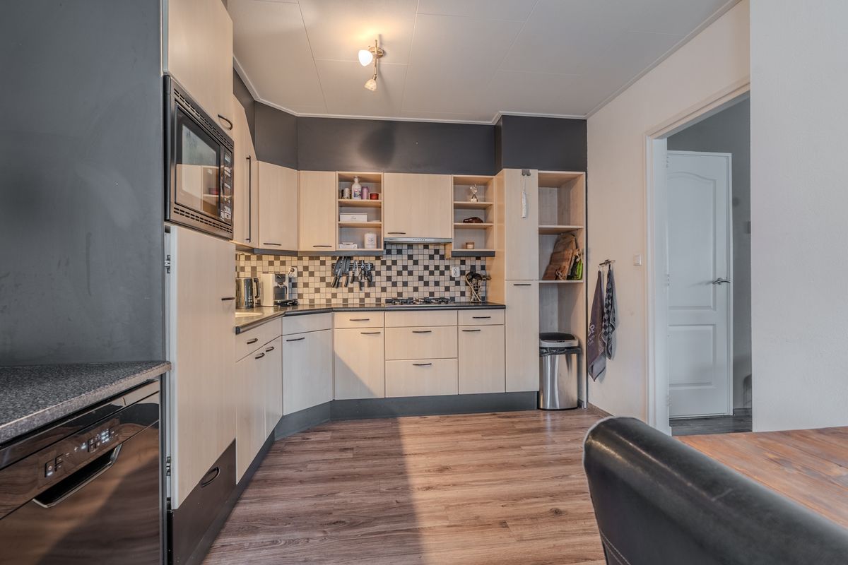 De gesloten keuken met eethoek is volledig ingericht en voorzien van diverse apparatuur, waaronder een 4-pits gaskookplaat, afzuigkap, koelkast, magnetron en een (losse) vaatwasser, waardoor koken en tafelen zowel praktisch als gezellig is.