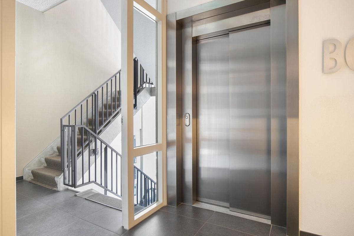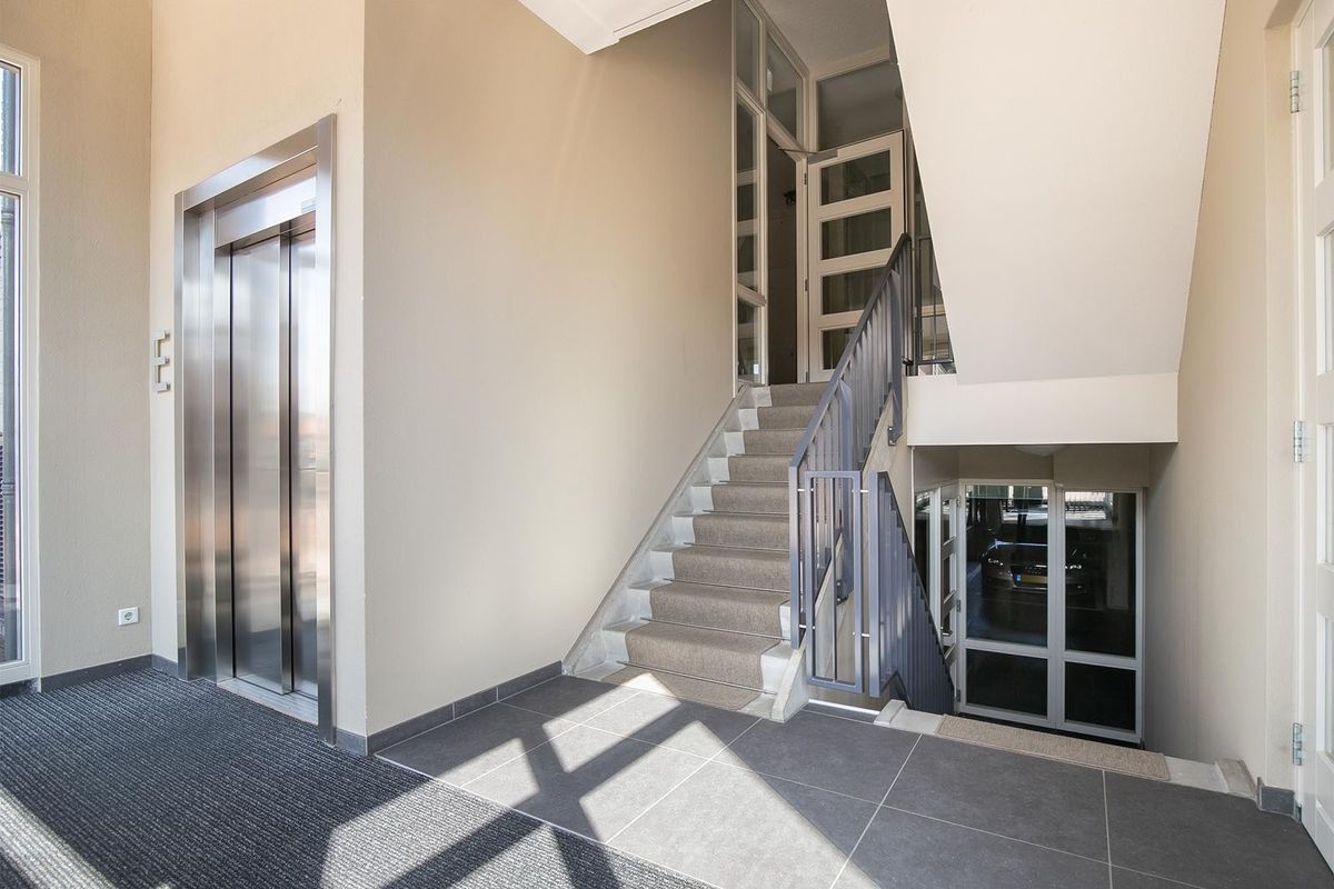 Entree op de begane grond met trappenhuis en lift van het appartementengebouw aan de Zuiderzeeboulevard.