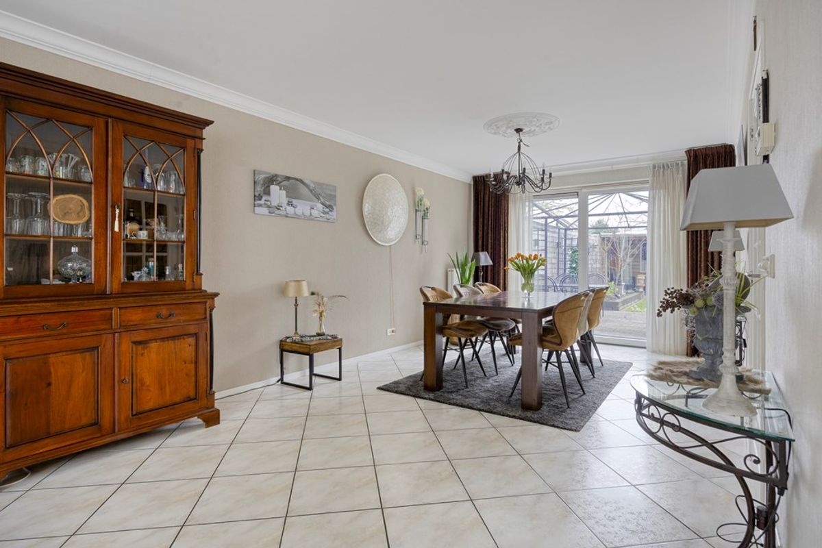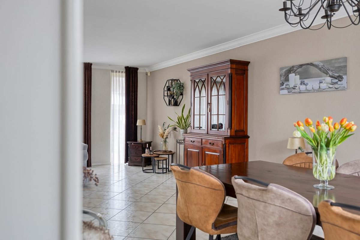 De woonkamer aan de voorzijde is licht en ruim opgezet, met grote raampartijen die zorgen voor een prettige daglichttoetreding. De zithoek en eetkamer staan in open verbinding met elkaar en bieden volop ruimte voor een royaal gezinsleven en lange diners.