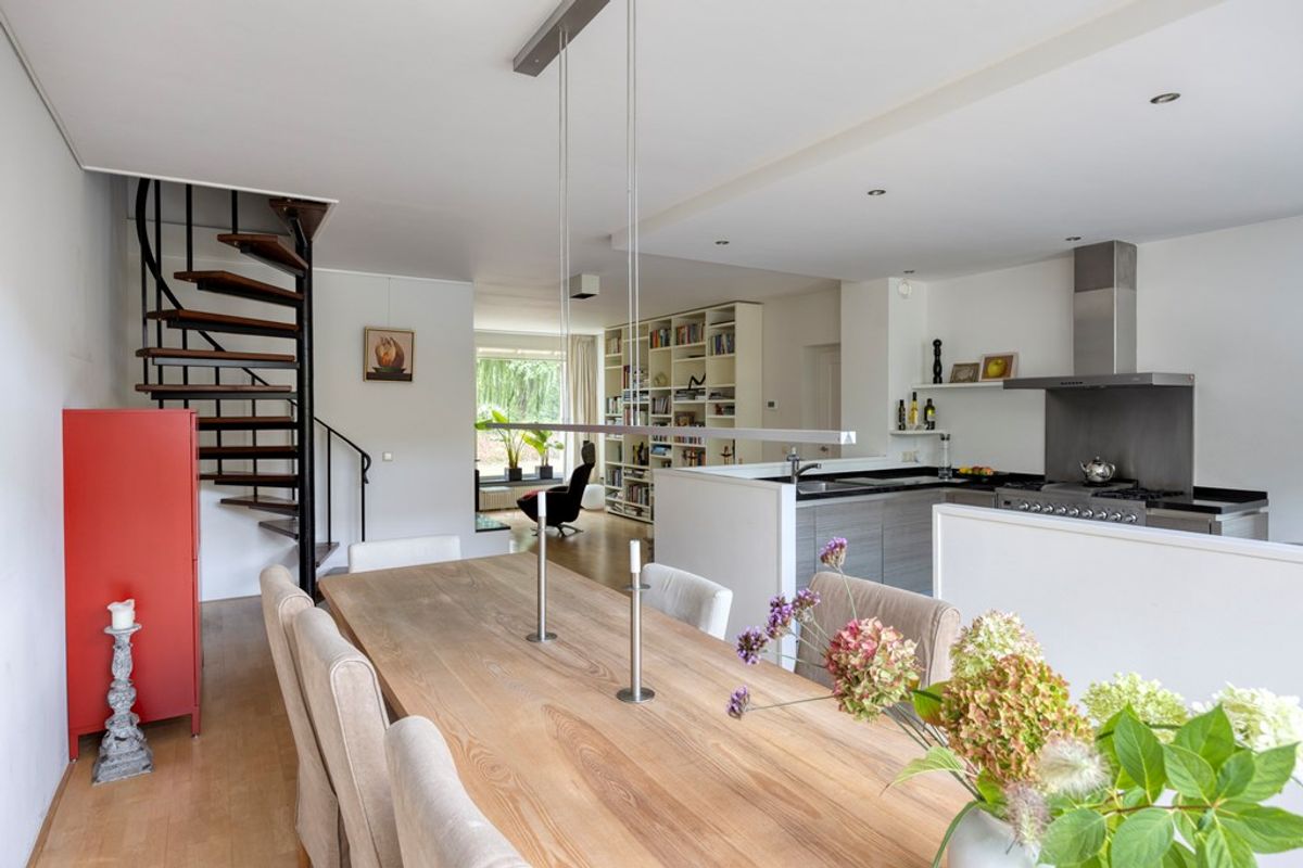 Met trap naar de verdieping, essen parketvloer, open haard (gas).